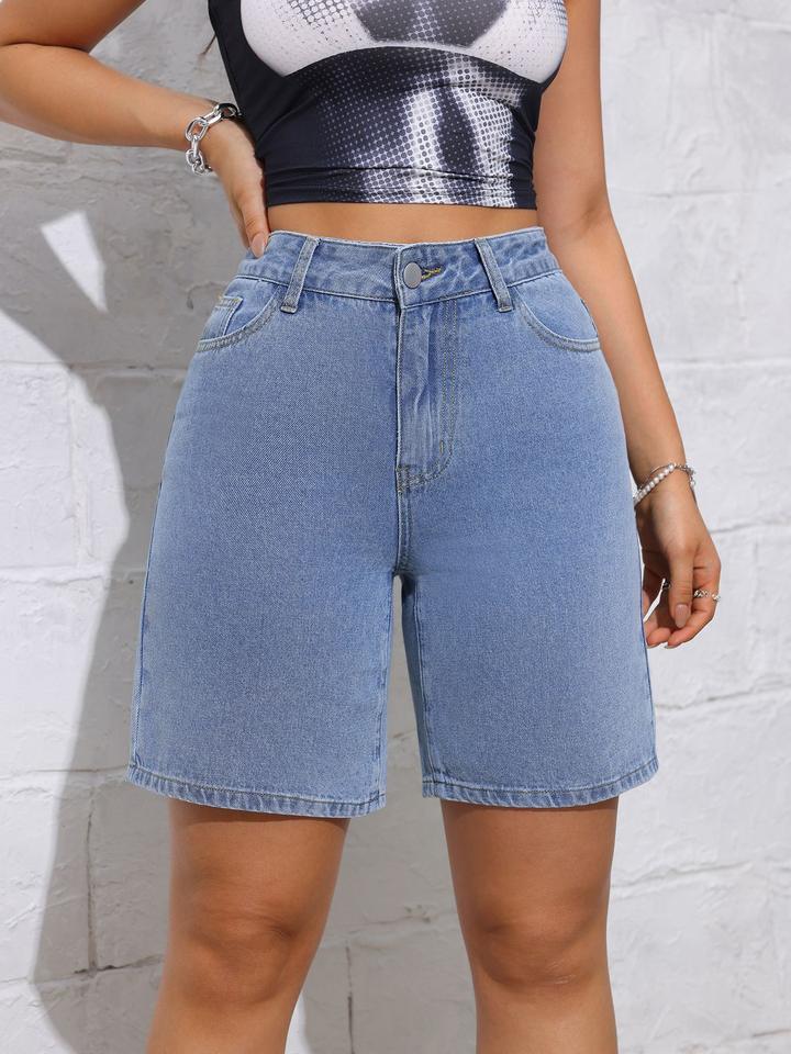 กางเกงยีนส์ขาสั้นเอวสูงสำหรับผู้หญิงกางเกงขากว้างกางเกงขาสั้นทรงตรงสีน้ำเงินวินเทจสำหรับฤดูร้อน