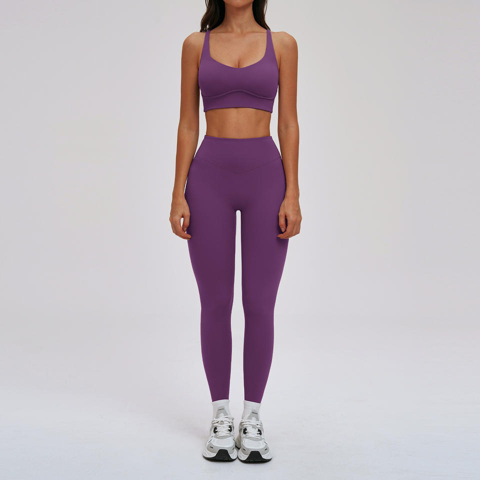 กางเกงโยคะเอวสูงกระชับสัดส่วนยกสะโพกพร้อมชุดเสื้อชั้นในกีฬาแบบกันกระแทก ชุดออกกำลังกายวิ่งเรียบง่ายสำหรับผู้หญิง 2 ชิ้น