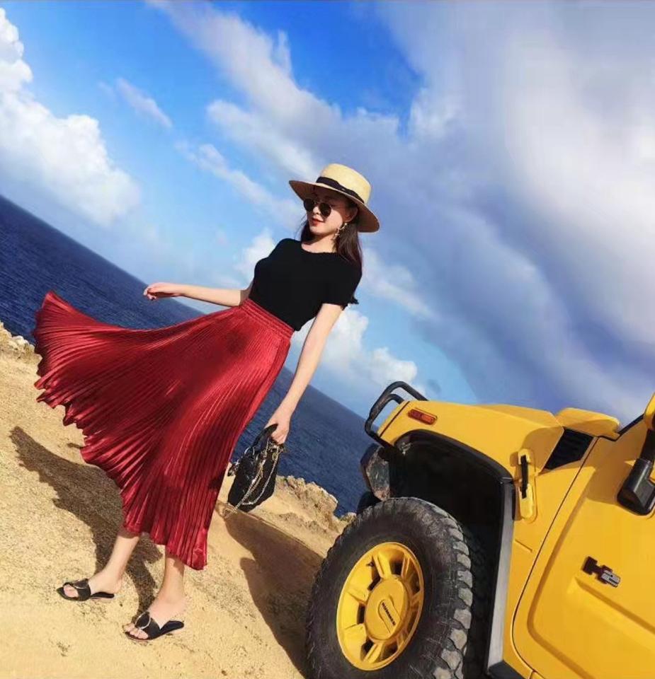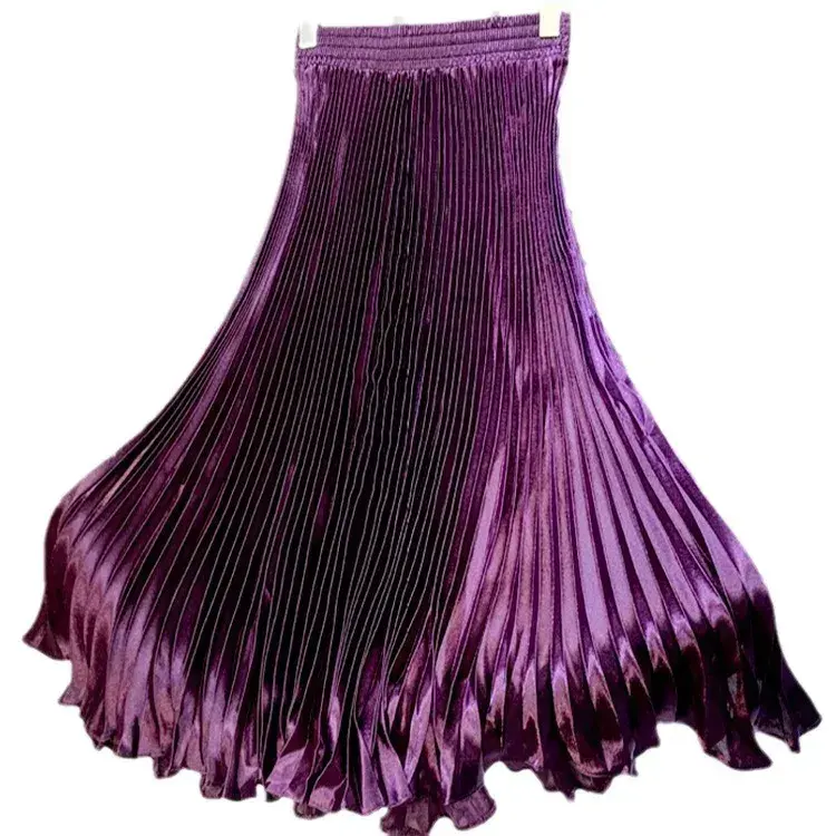 กระโปรงเต้นรำเอวสูงความยาวปานกลางยาว1เมตรผ้าซาตินสีสันสดใสสะท้อนแสงพร้อมดีไซน์หลายจีบหางปลา