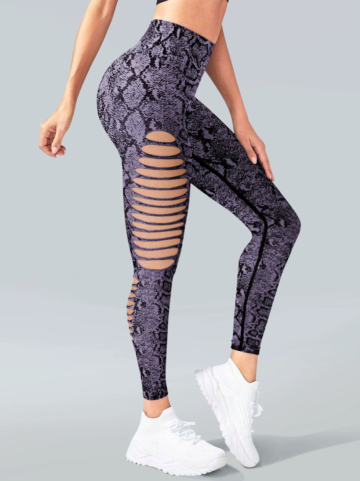 กางเกงโยคะเอวสูงลายรังผึ้งสีม่วงขาดๆ แบบรัดรูป ยืดหยุ่นสำหรับผู้หญิงเล่นกีฬา