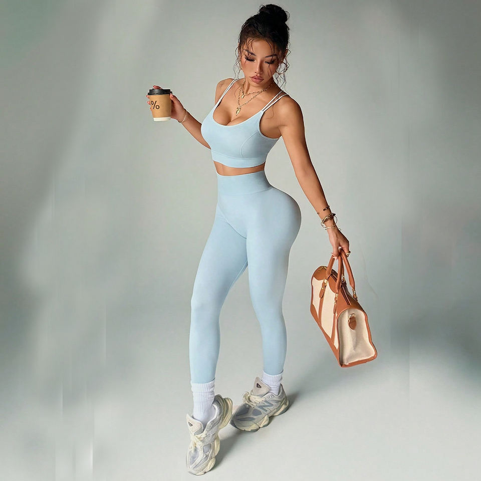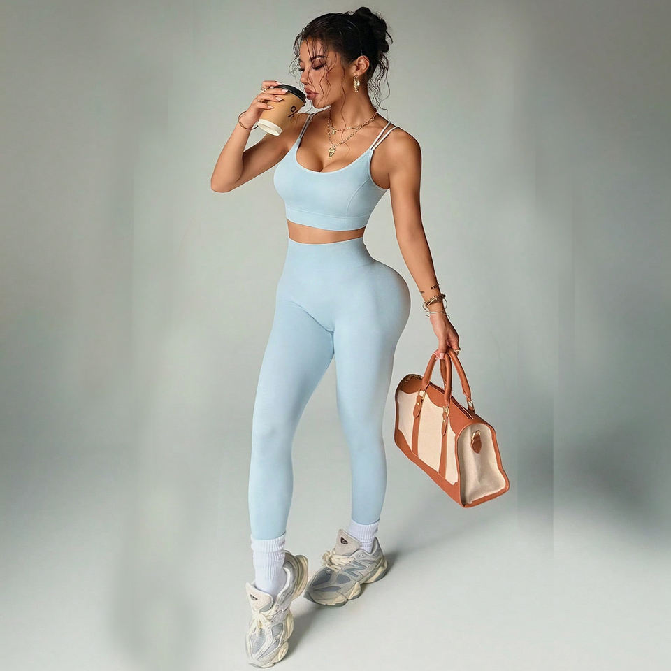 ชุดออกกำลังกายไร้ตะเข็บเอวสูง ระบายอากาศได้ดี กางเกงเลกกิ้งน้ำหนักเบา สปอร์ตบราเสริมฟองน้ำ ดีไซน์ลายเรียบหรูทันสมัย