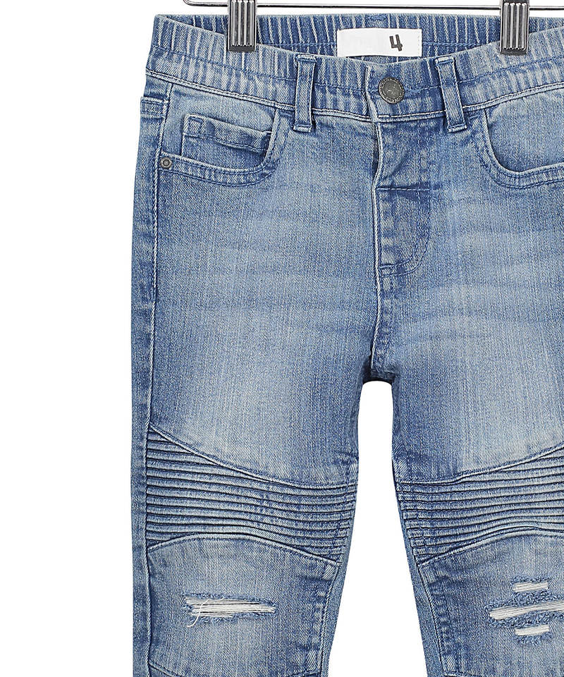 คำอธิบาย:กางเกงยีนส์ Moto สำหรับนักขี่จักรยานเด็กแบบดึง