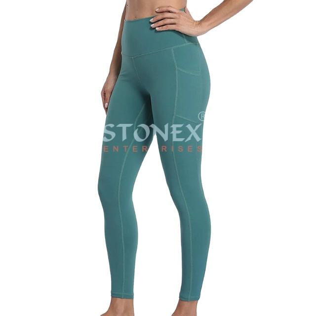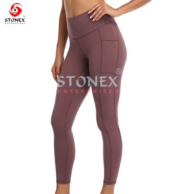 เลกกิ้งเอวสูงทรงสลิมฟิตลำลองสำหรับผู้หญิงผ้าโพลีเอสเตอร์และผ้าสแปนเด็กซ์นุ่มมีกระเป๋าลายสีพื้น