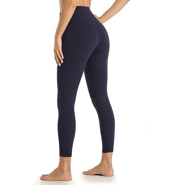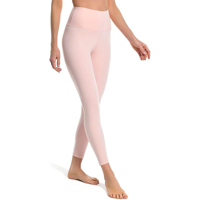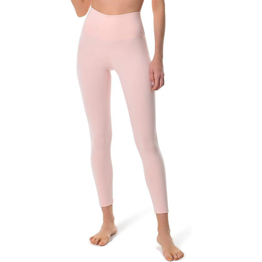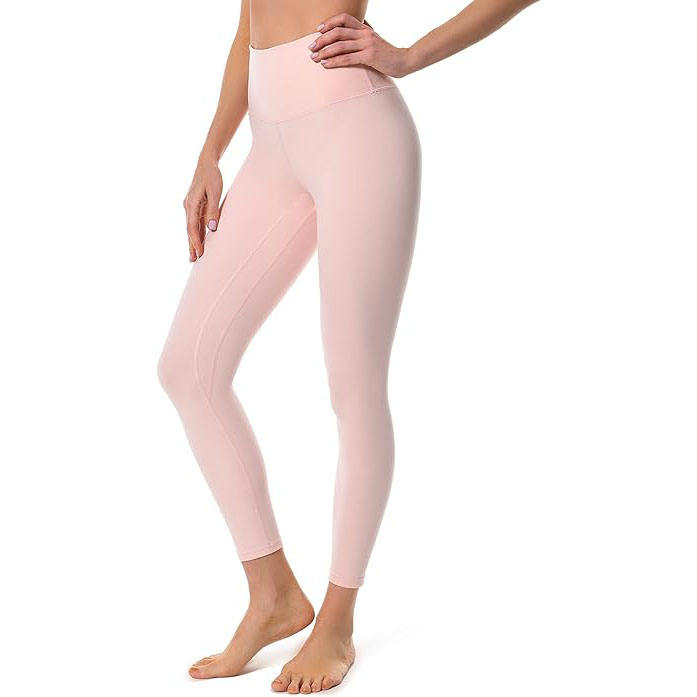 กางเกงกีฬาเอวสูงของผู้หญิงกางเกงเลกกิ้งผ้ายืดสีพีช/ผ้าไนลอนผ้าสแปนเด็กซ์ด้านนอกลายสีทึบปิดเอวยางยืด