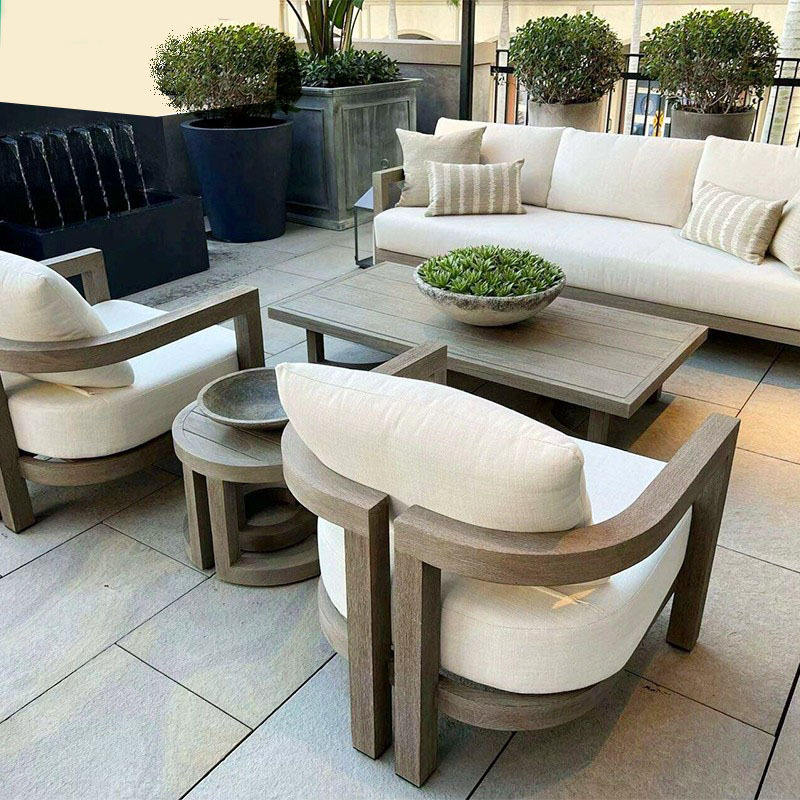 ชุดเฟอร์นิเจอร์ไม้สักกลางแจ้งแบบสั่งทำระดับไฮเอนด์ ดีไซน์ยุโรปเหนือ พร้อมเบาะกันน้ำและกันแดด สำหรับลานบ้าน ระเบียง และสวน