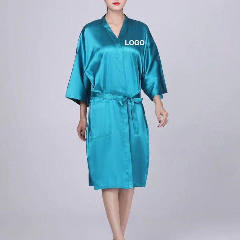 ชุดคลุมกิโมโนแฟชั่นผ้าซาตินโพลีเอสเตอร์100% งานปักโลโก้ตามสั่งสำหรับทำผมสปาความงามแบบไม่ไฟฟ้าสถิต