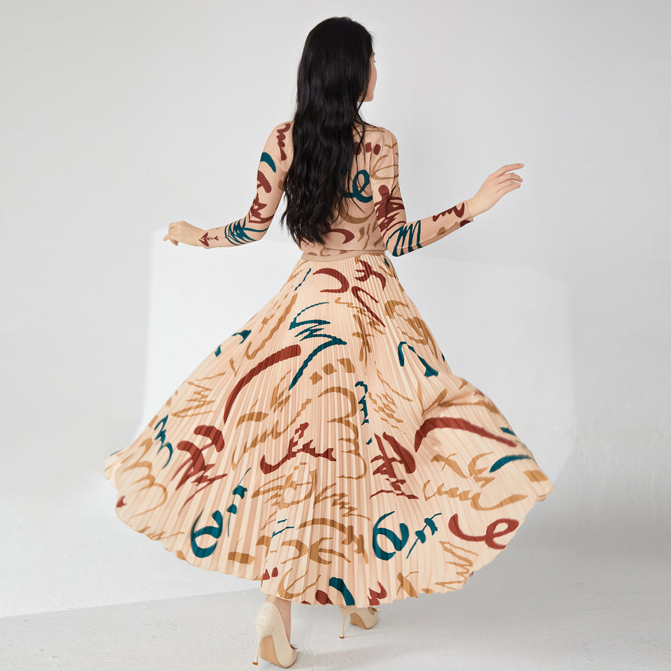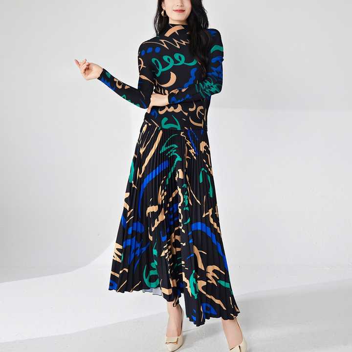 Miyake ชุดสูทจีบผู้หญิงแฟชั่นใหม่ฤดูใบไม้ผลิพิมพ์ลายและกระโปรงจีบชุด2ชิ้นเสื้อผ้าผู้หญิง