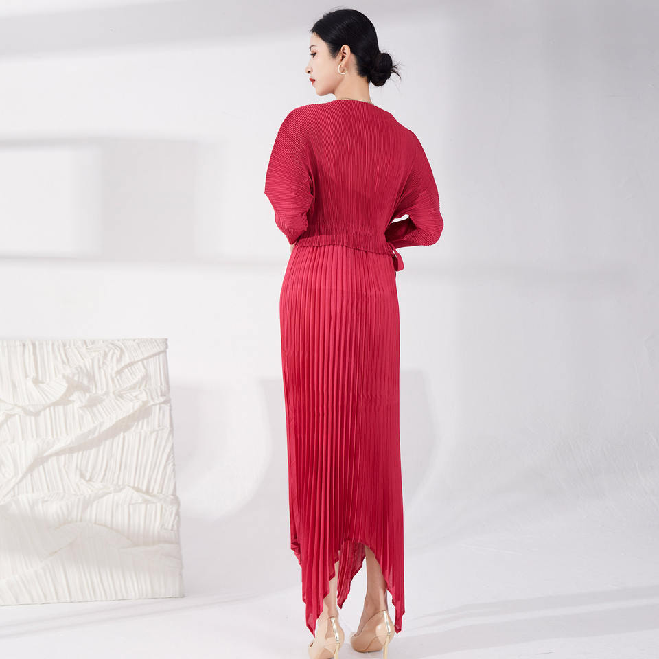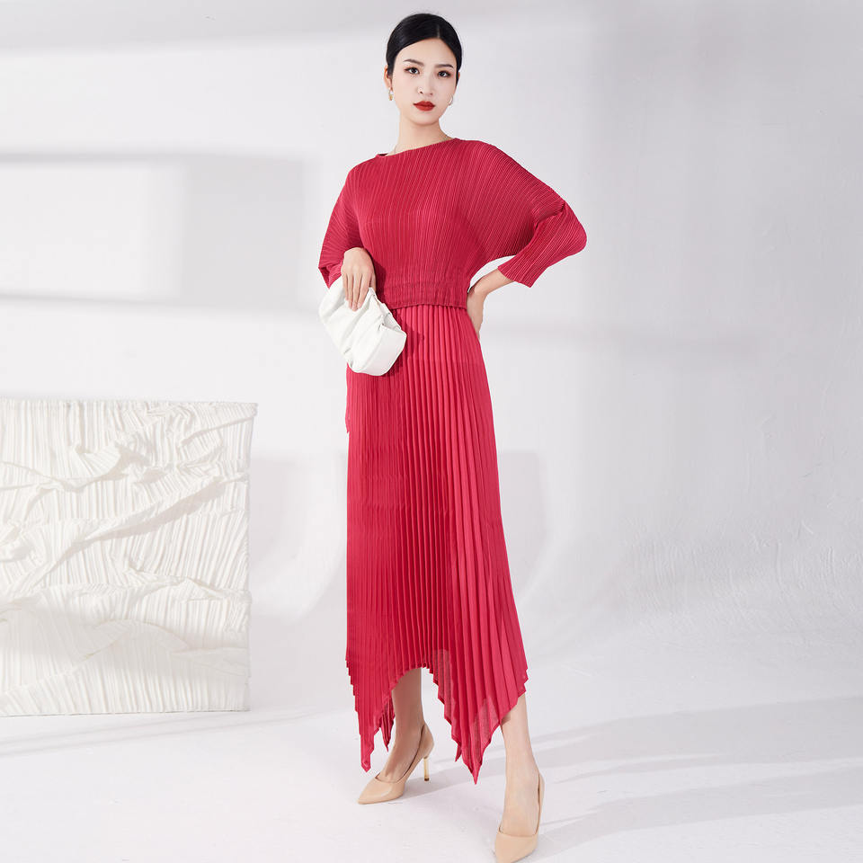 เดรสมิดิแบบจีบสำหรับผู้หญิงเดรสผ้าคาดเอวสีพื้นเอวธรรมชาติหรูหราในฤดูใบไม้ผลิสไตล์ใหม่