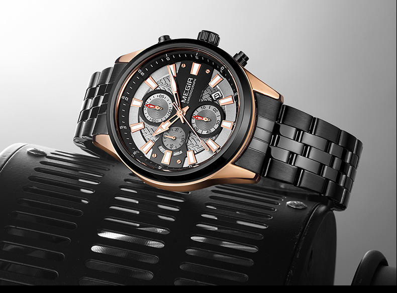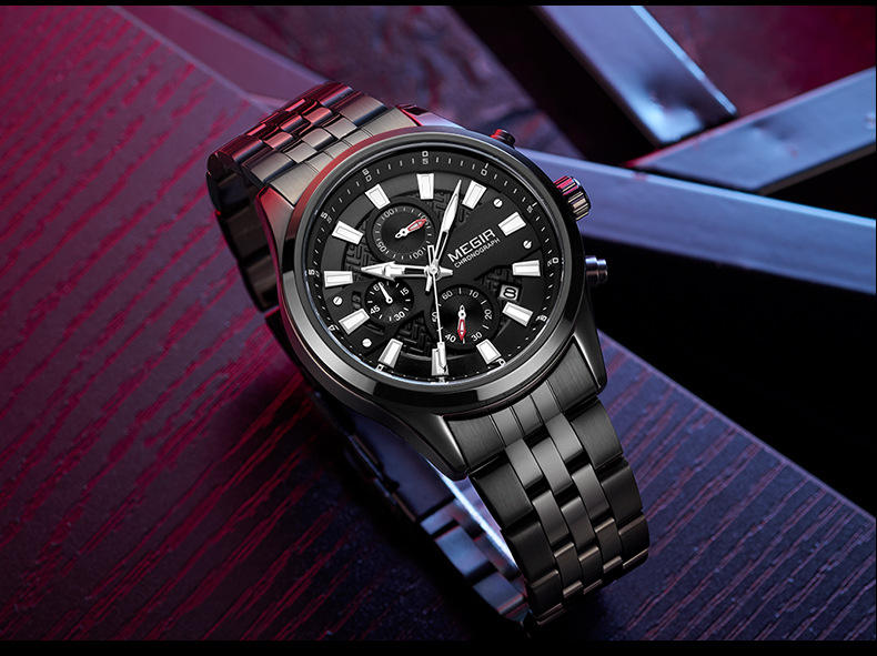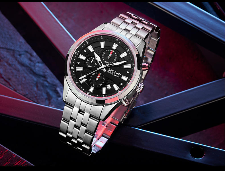 นาฬิกาควอตซ์แนวธุรกิจสำหรับผู้ชายสร้อยข้อมือเหล็กโครโนกราฟปฏิทินระดับไฮเอนด์