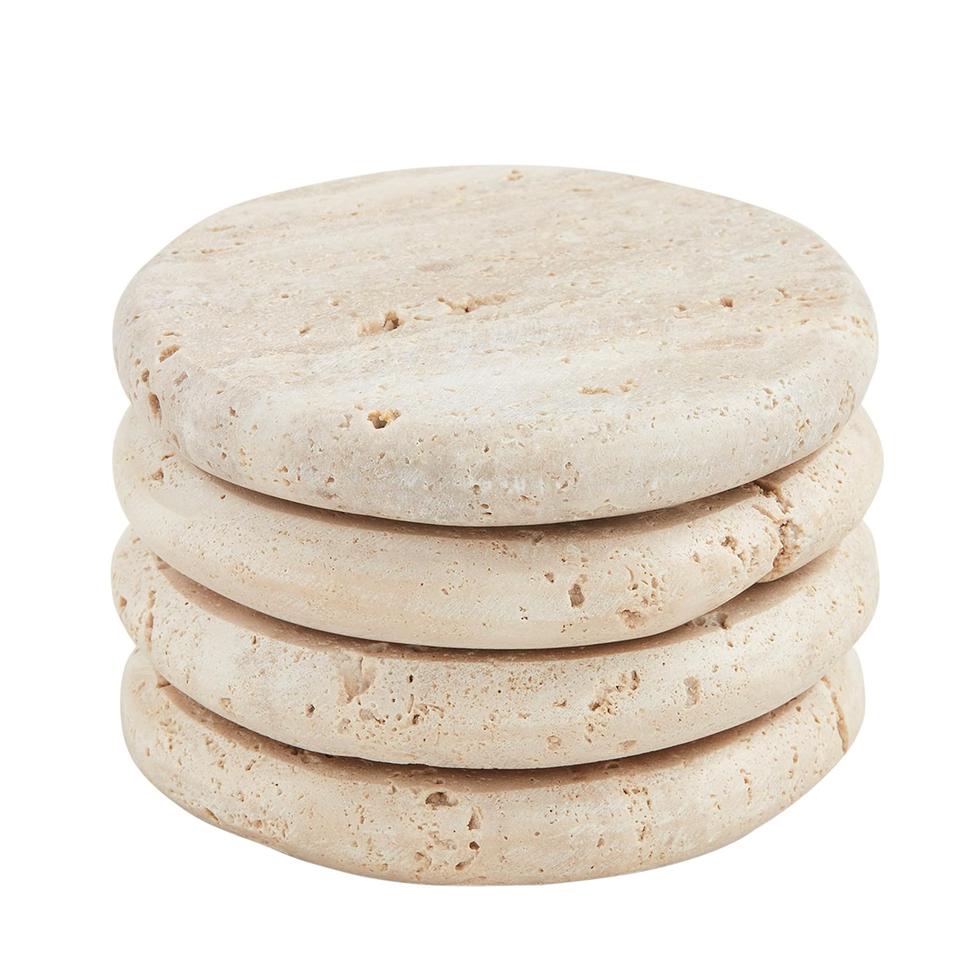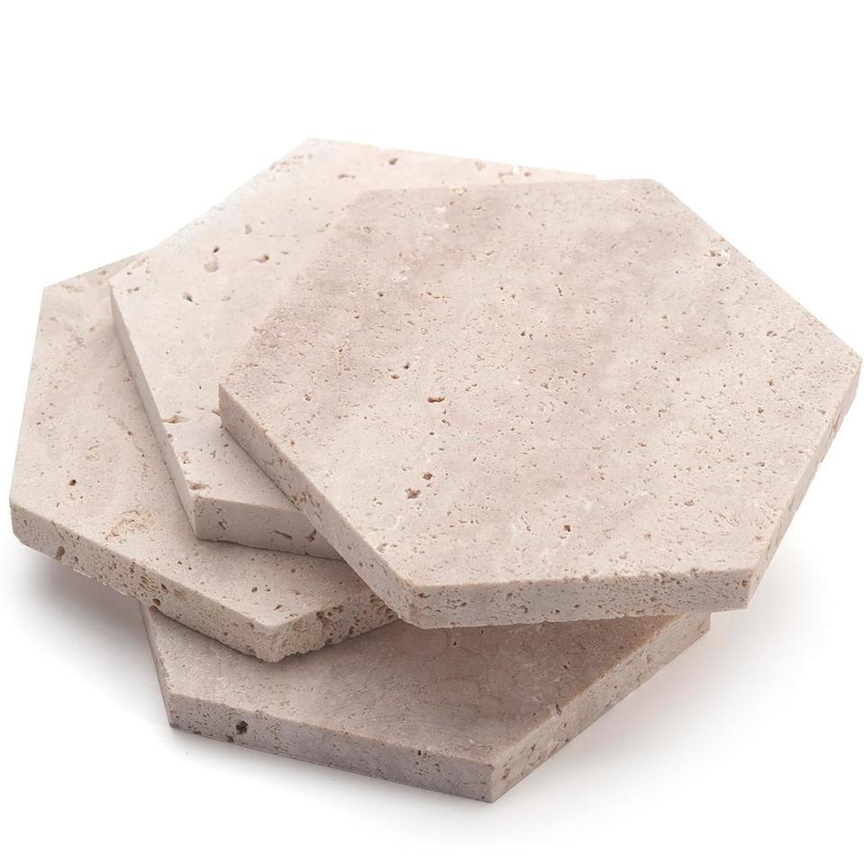 ที่รองแก้วหินอ่อน Travertine สุดหรูพร้อมมุมโค้งอุปกรณ์ตกแต่งโต๊ะหรูหราอุปกรณ์เครื่องดื่มคุณภาพระดับพรีเมียม