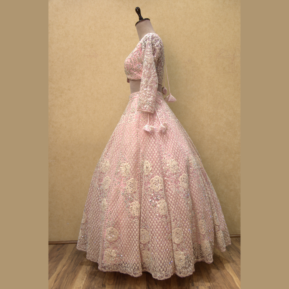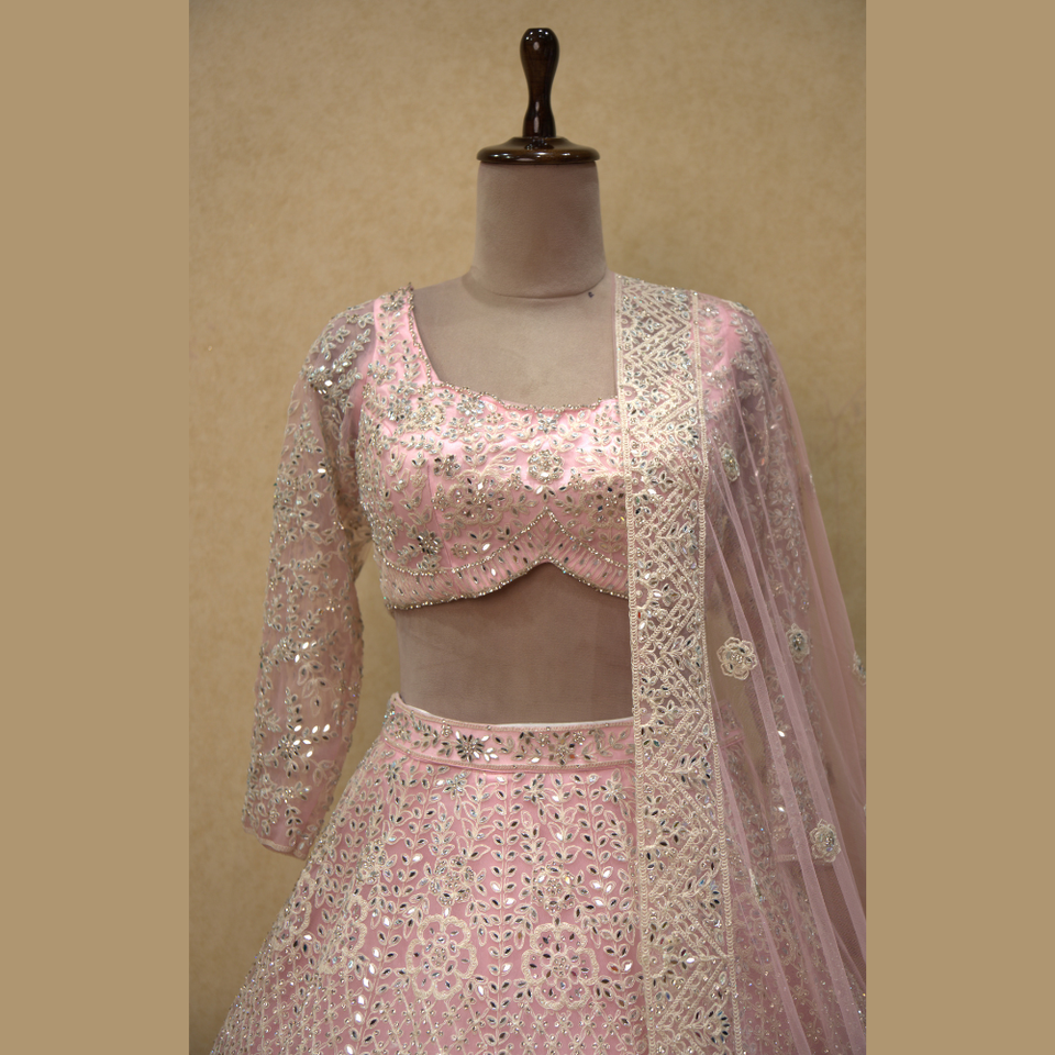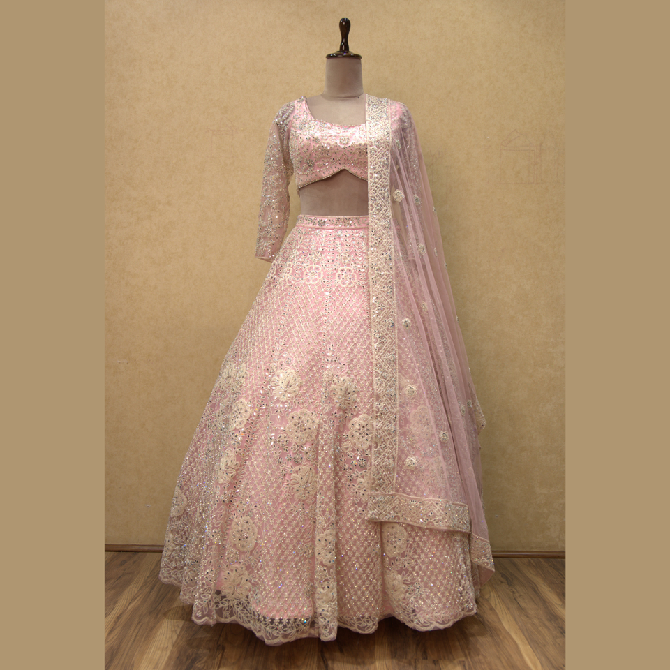 เลอฮิงกาสีชมพูบลัชออนตาข่ายนิ่มมีรายละเอียดกระจกและเพชรหรูหราตามต้องการจากอินเดียในราคาขายส่ง