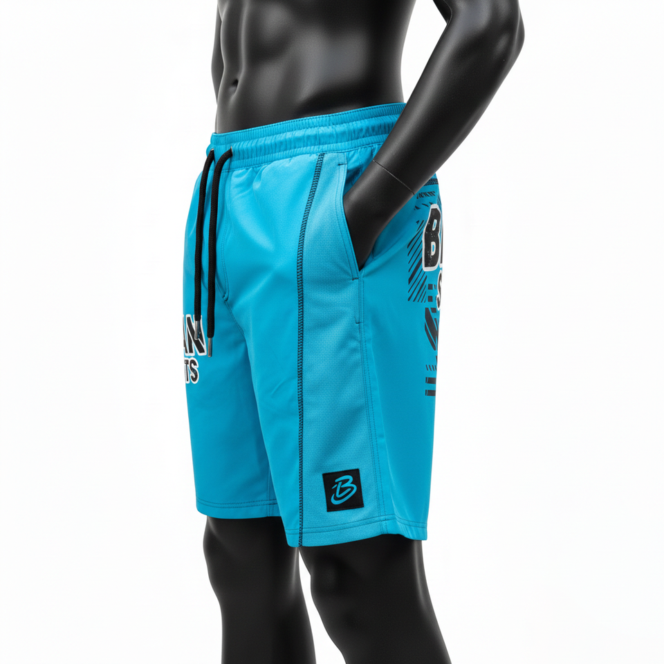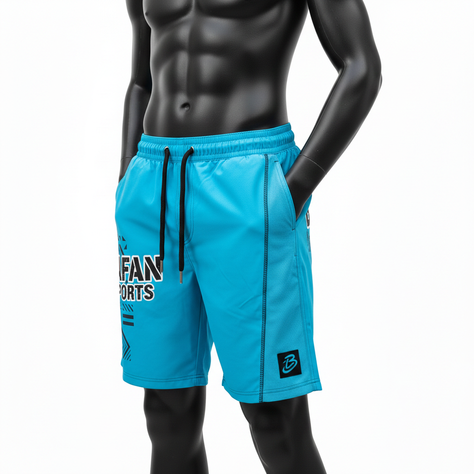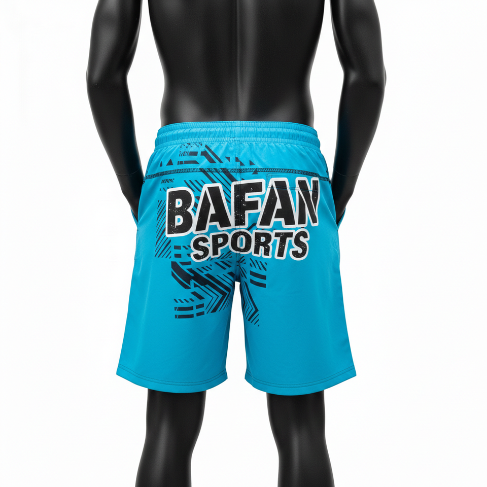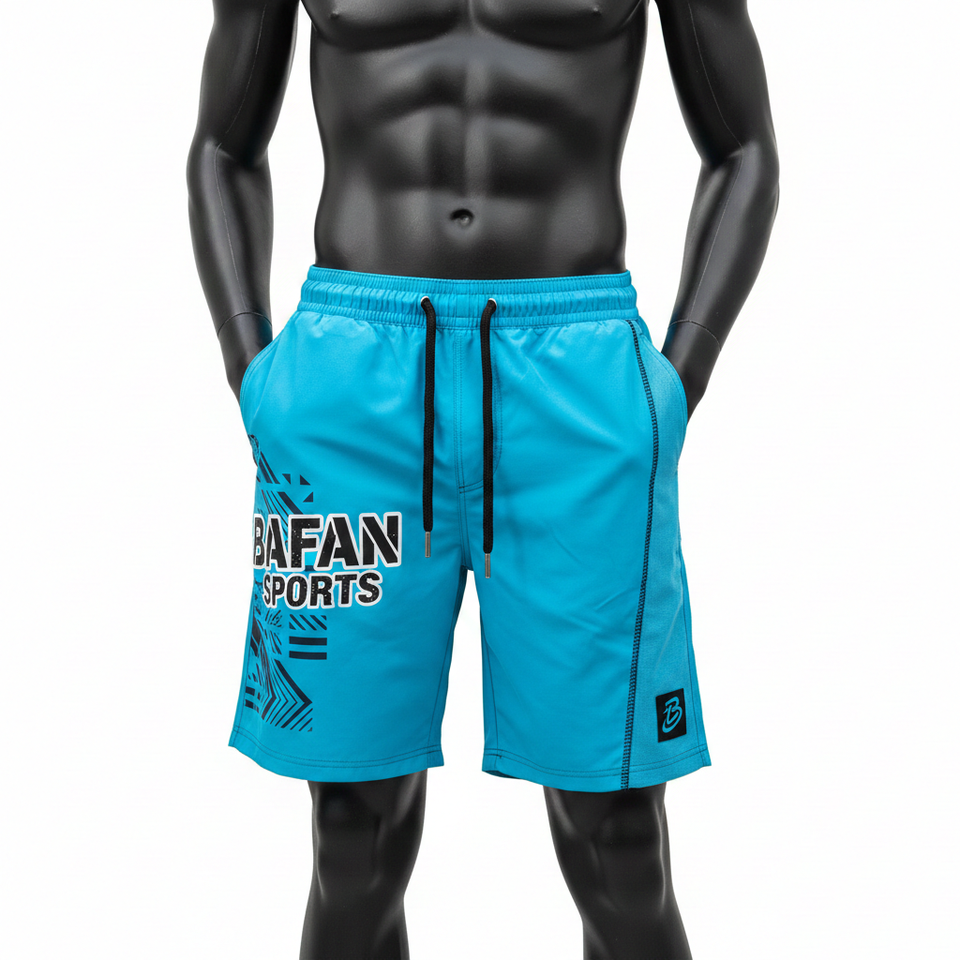 กางเกงว่ายน้ำโพลีเอสเตอร์คุณภาพสูง 140 GSM แห้งเร็ว สีเทอร์ควอยซ์ แต่งแถบข้างสีดำ พร้อมโลโก้แบบรีดร้อน สำหรับใส่ชายหาด ผู้ชาย