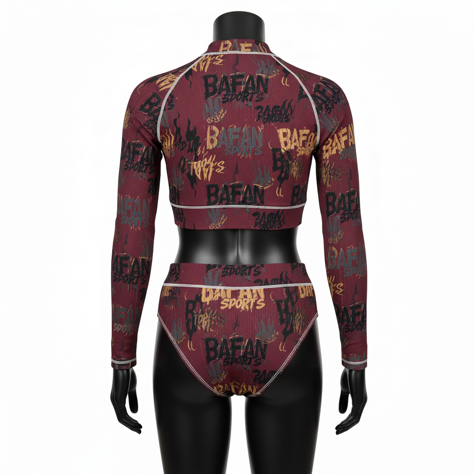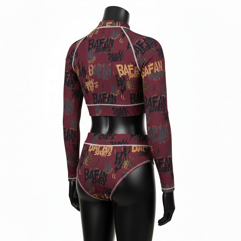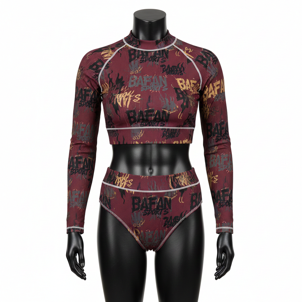 ชุดบิกินี่คุณภาพสูง 185 GSM ผ้าโพลีสแปนเด็กซ์สีแดงเบอร์กันดี ผ้าริบถักยืดหยุ่น พิมพ์ลายเต็มตัว พร้อมโลโก้แบบรีดร้อน สำหรับผู้หญิง