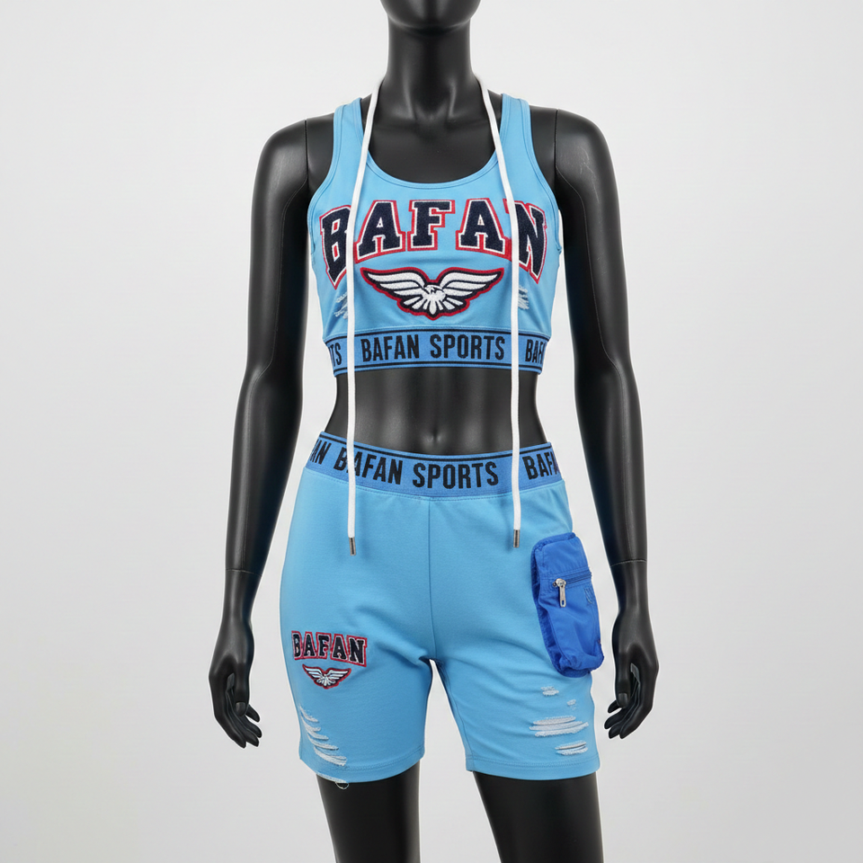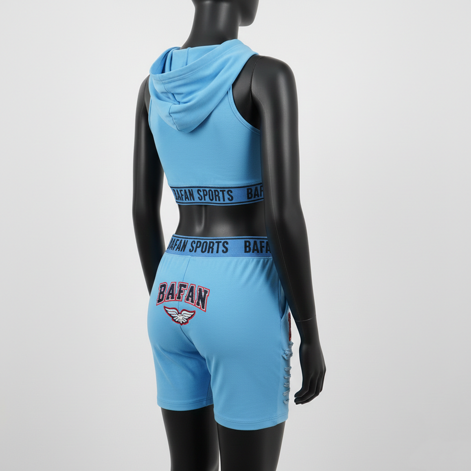 ชุดบิกินี่คุณภาพสูง 185 GSM ผ้าโพลีสแปนเด็กซ์ สีฟ้าอ่อน ผ้าเนื้อยืดหยุ่น มีกระเป๋าอเนกประสงค์ แผงด้านข้างมีโลโก้ปัก สำหรับผู้หญิง