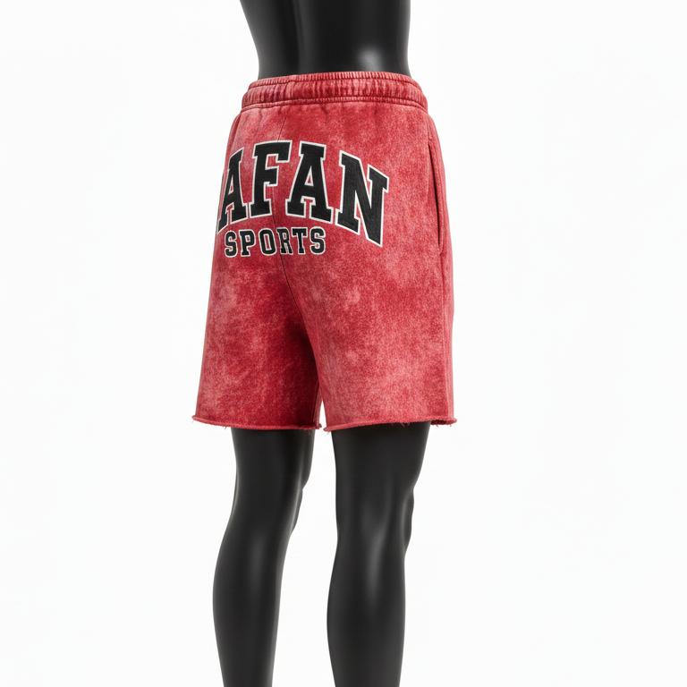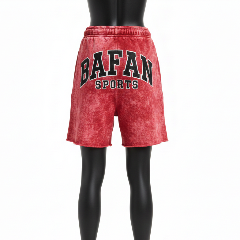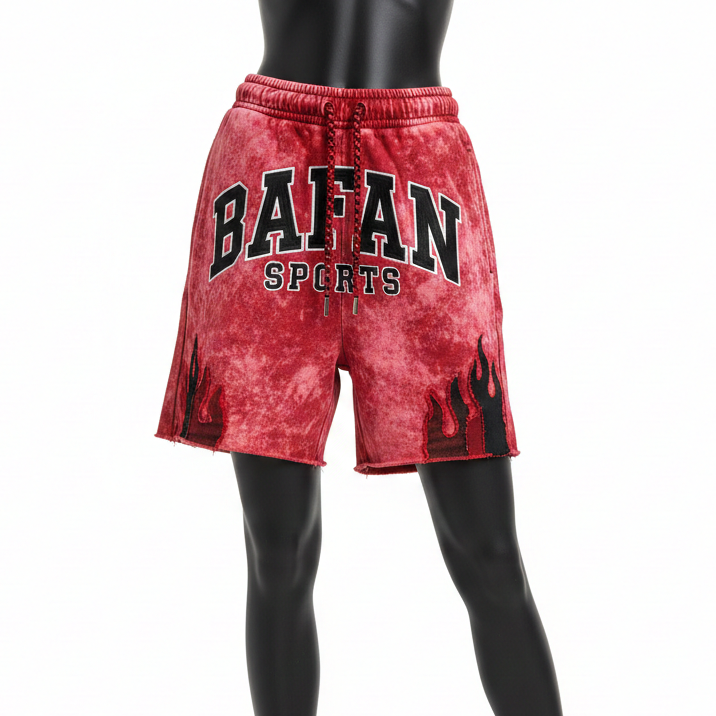 กางเกงขาสั้นกีฬาสีแดงผ้าฝ้ายฟลีซคุณภาพสูง 320 GSM ล้างสีแบบแอซิดวอช แต่งแถบสีดำลายเปลวไฟ ปักโลโก้ตามสั่ง กางเกงขาสั้นผู้หญิง