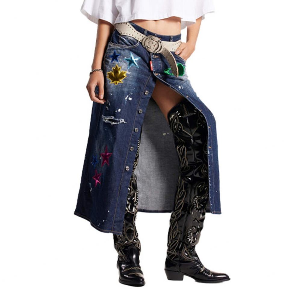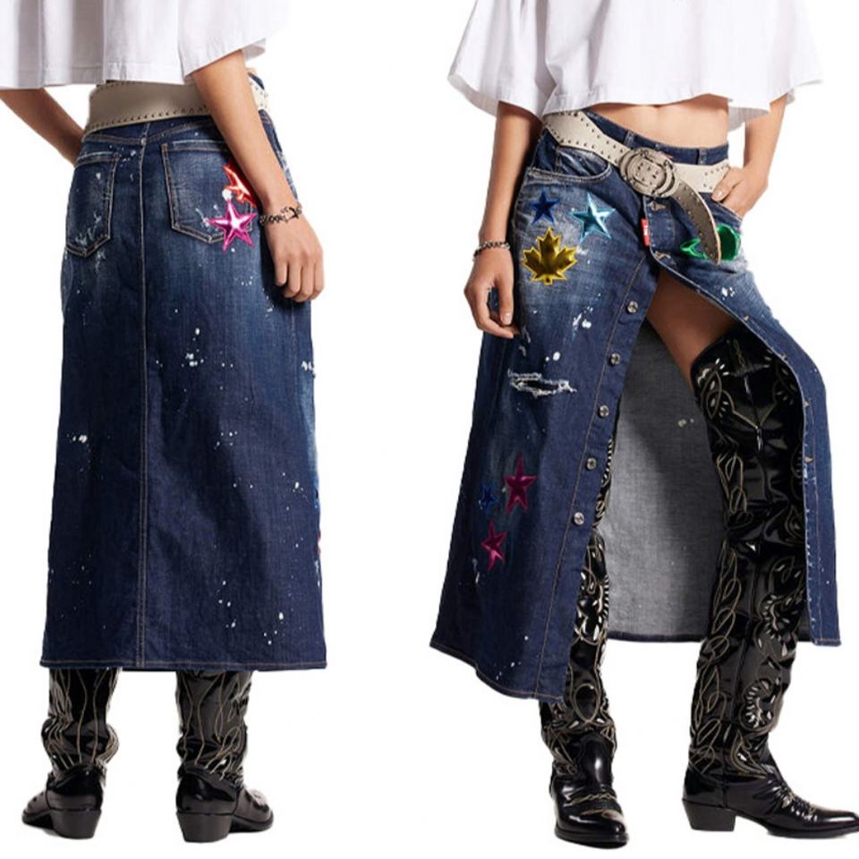 กระโปรงยาวผู้หญิงสไตล์ Y2K แบรนด์แฟชั่นโลโก้สั่งทำคุณภาพสูง แต่งขาดแบบดิบ ตกแต่งด้วยแผ่นโลหะ ลุคซักฟอกสีเข้ม