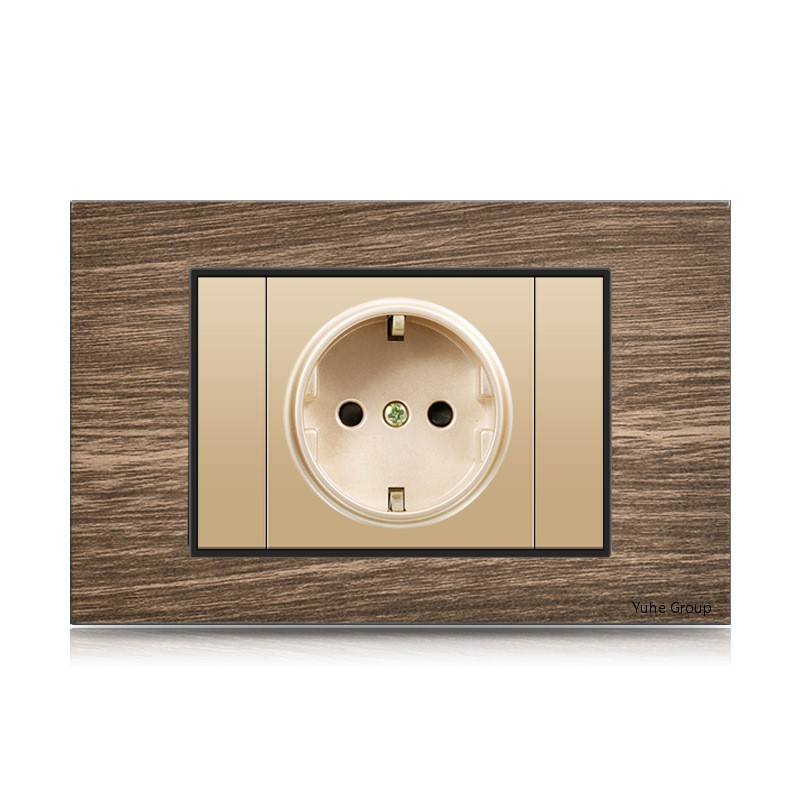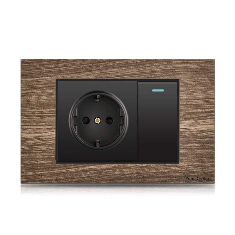 แผงสัมผัสคุณภาพสูง ทนทาน ผลิตจากอะลูมิเนียมลายไม้ มาตรฐานยุโรป ขนาด 118x72 มม. สวิตช์และเต้ารับติดผนังแบบเยอรมัน