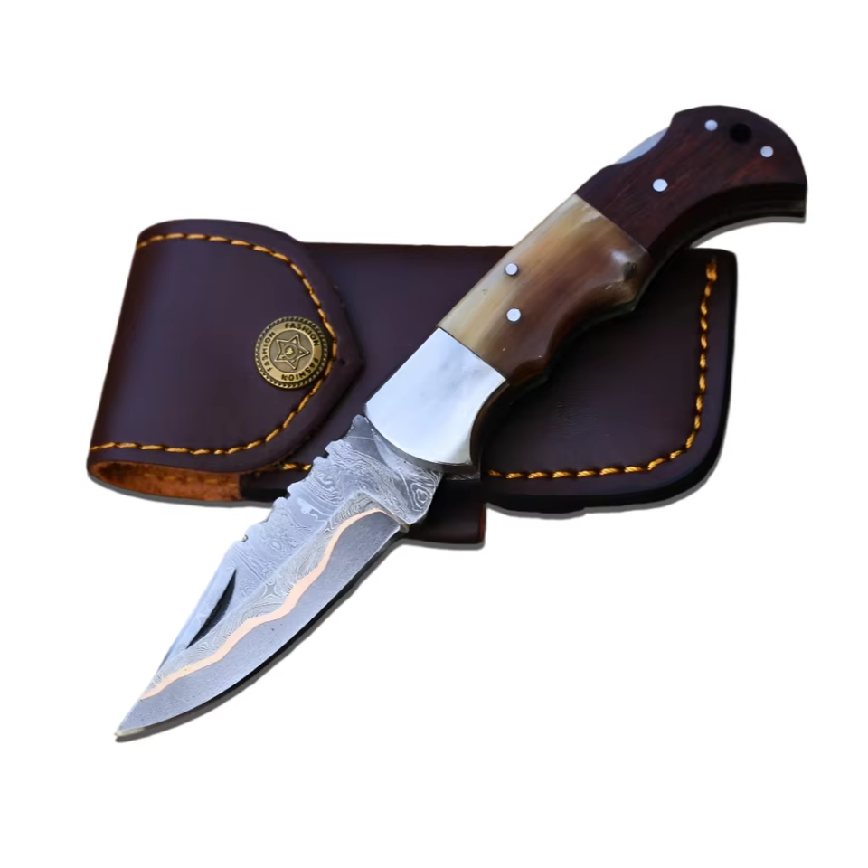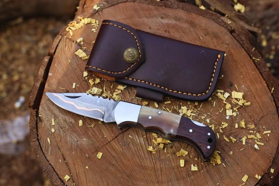 มีดพับได้มีกระเป๋าเหล็กดามัสกัสแบบพกพามีดล่าสัตว์กลางแจ้งพร้อมปลอกหนังง่ายต่อการถือชุดมีดดามัสกัส