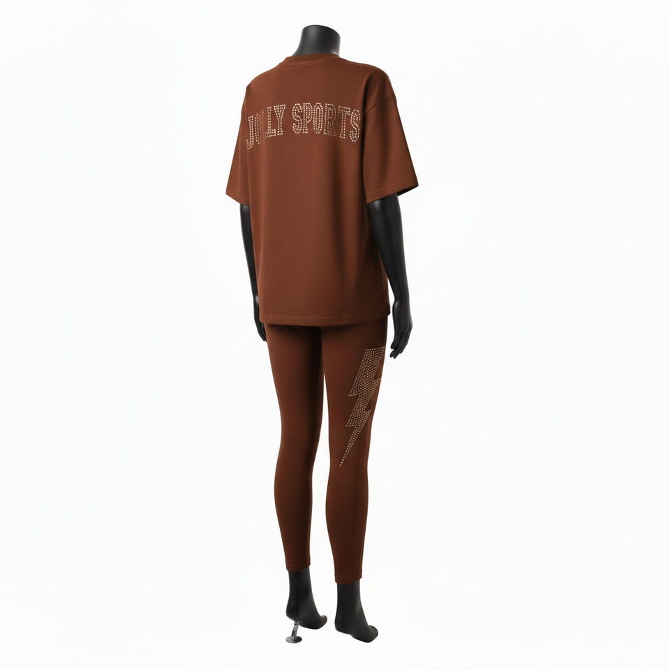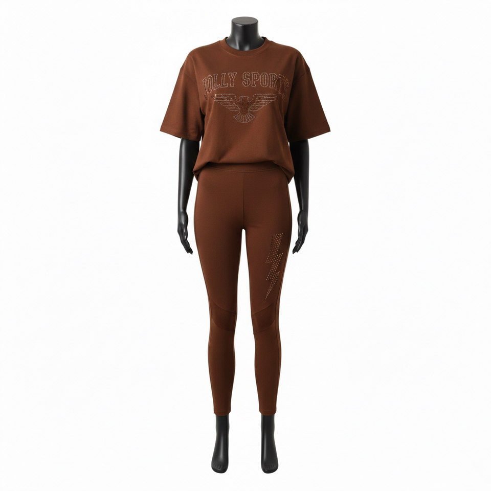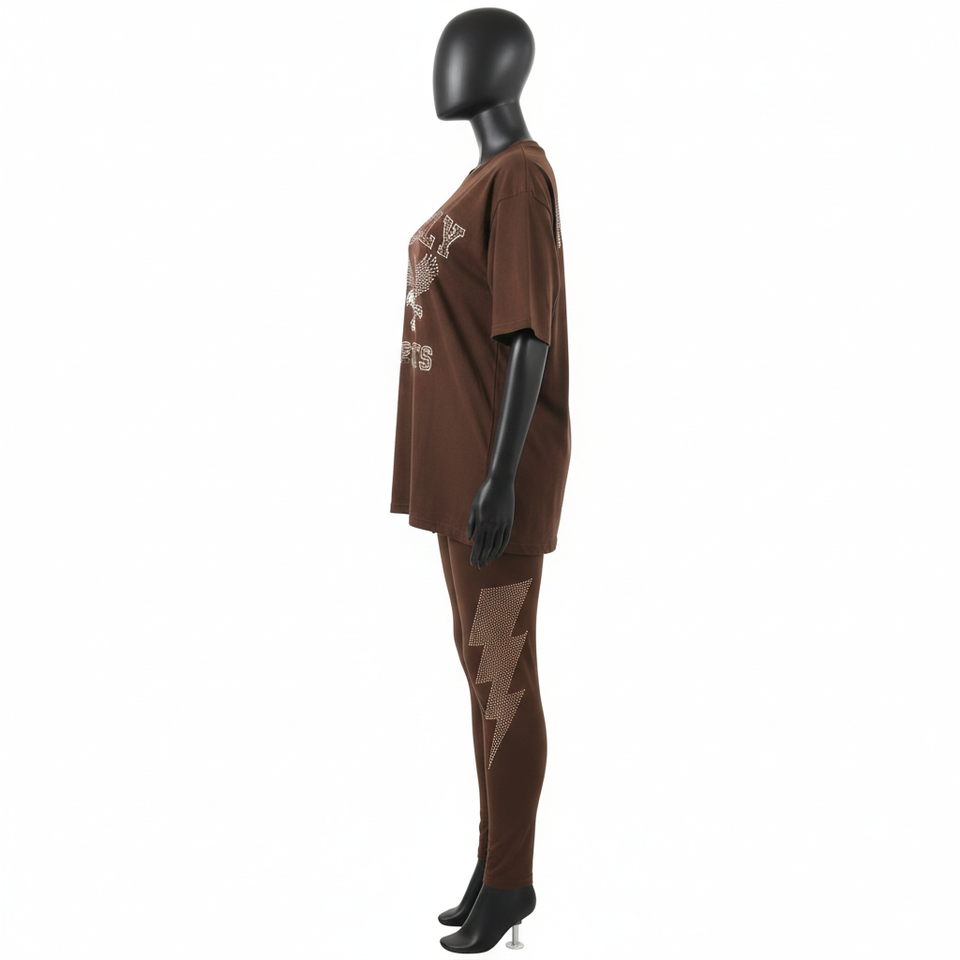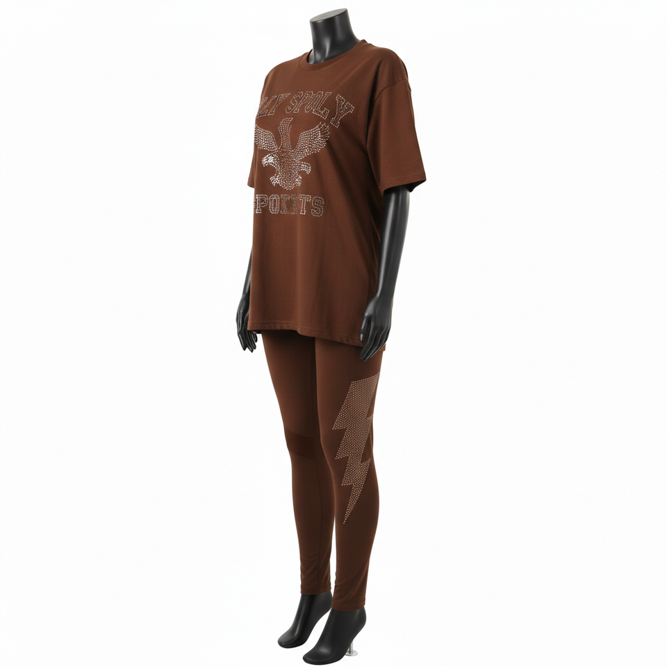 ชุดเสื้อยืดและเลกกิ้งสีน้ำตาลสำหรับผู้หญิง ผ้าฝ้ายผสมโพลีเอสเตอร์ยืดหยุ่นคุณภาพสูง พร้อมลายปักคริสตัลแบบรีดร้อนตามสั่ง ชุดสำหรับผู้หญิง