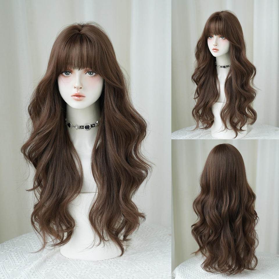 ผมปลอมสีน้ำตาลน้ำผึ้งคุณภาพสูง ทนความร้อน ผลิตด้วยเครื่องจักร ทรงผมยาวหยักศกใหญ่ พร้อมหน้าม้าฟูฟ่อง เต็มศีรษะ สำหรับผู้หญิง