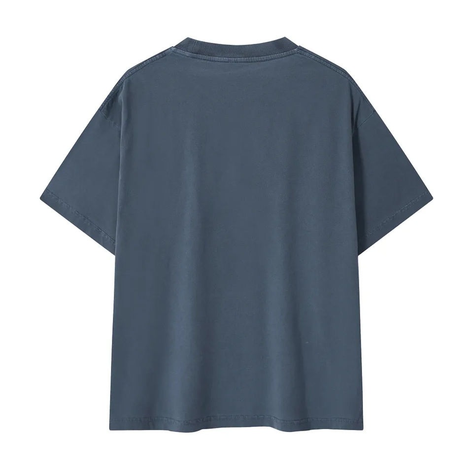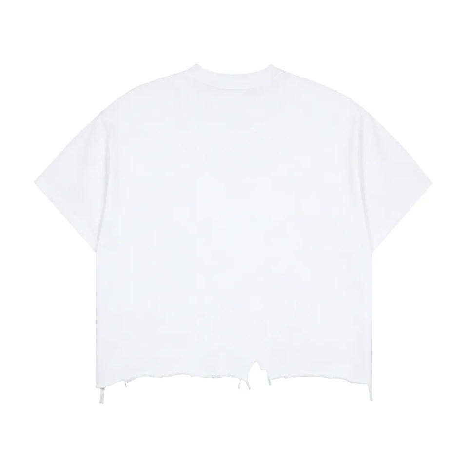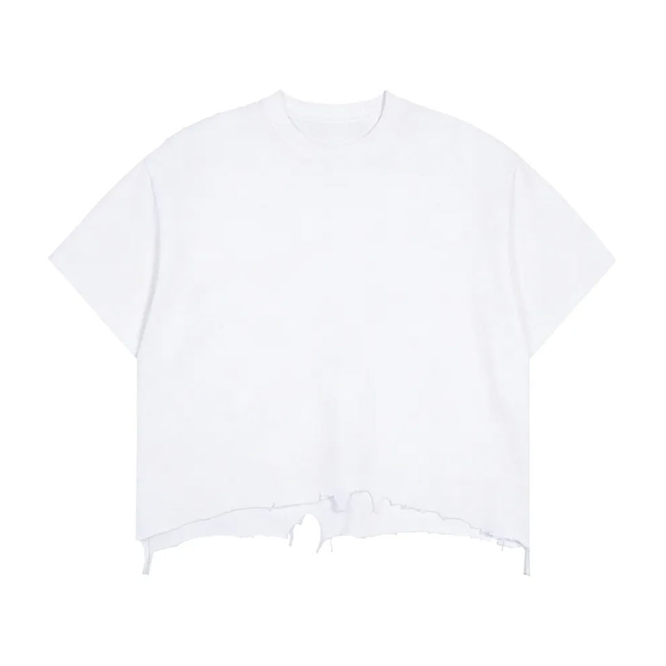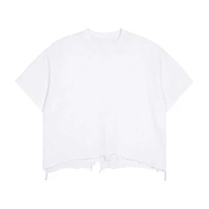 เสื้อยืดผู้ชายแขนสั้นทรงบ็อกซี่ผ้าฝ้ายแท้คุณภาพสูง สไตล์เรโทรสตรีทแบบดิสเทรส ดีไซน์ขาดๆ
