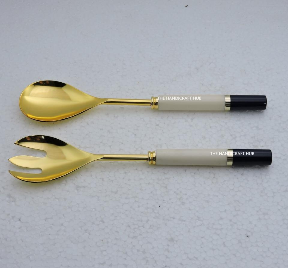 ชุดอุปกรณ์เสิร์ฟสลัดคุณภาพสูง สแตนเลสชุบทอง พร้อมด้ามจับไม้เคลือบลายเคลือบสี อุปกรณ์ครัว