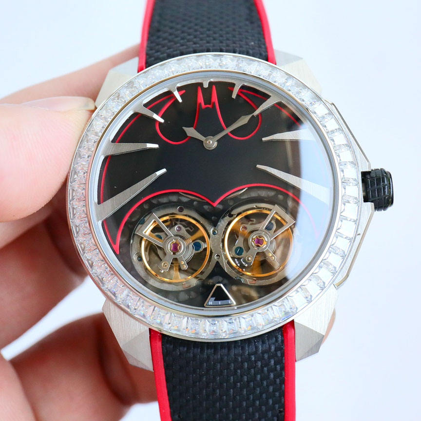 นาฬิกาข้อมือผู้ชายคุณภาพสูง ตัวเรือนเงิน ระบบตูร์บิญองคู่ ขอบหน้าปัดประดับเพชร สายสีแดงดำ หน้าปัดกลวง ระบบอัตโนมัติ