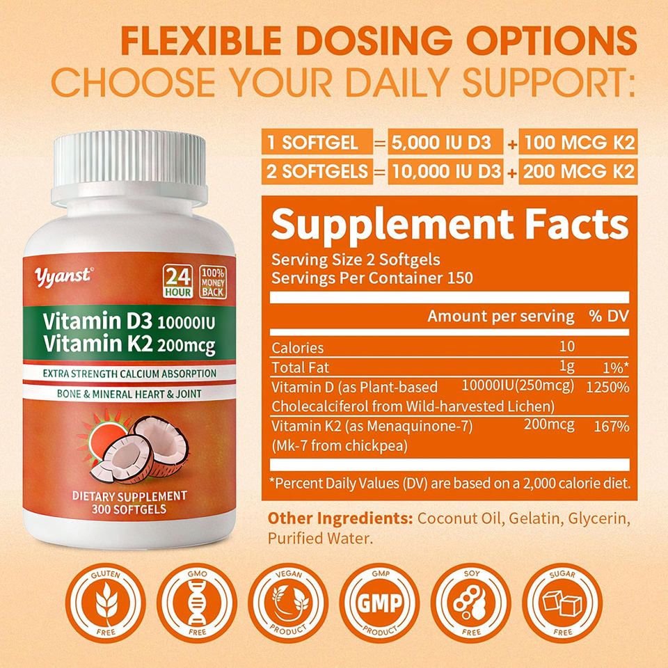 วิตามินดี3 และวิตามินเค2 คุณภาพสูง ช่วยในการดูดซึมแคลเซียม เสริมสร้างกระดูกและแร่ธาตุ บำรุงหัวใจและข้อต่อ ชนิดซอฟต์เจล