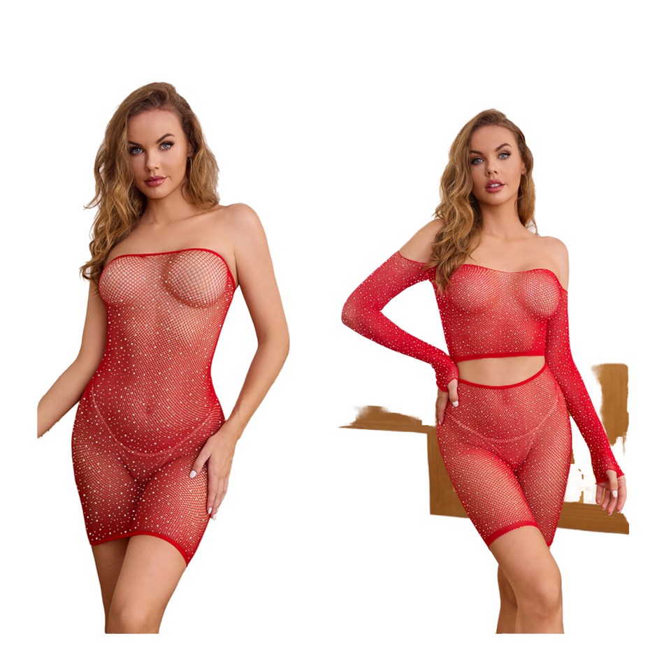 ชุดเดรสตาข่ายเปิดไหล่ประดับพลอยเทียมสำหรับผู้หญิงชุดเดรสถุงน่องแบบตาข่ายโปร่งใสเซ็กซี่ชุดชั้นในไร้รอยต่อ