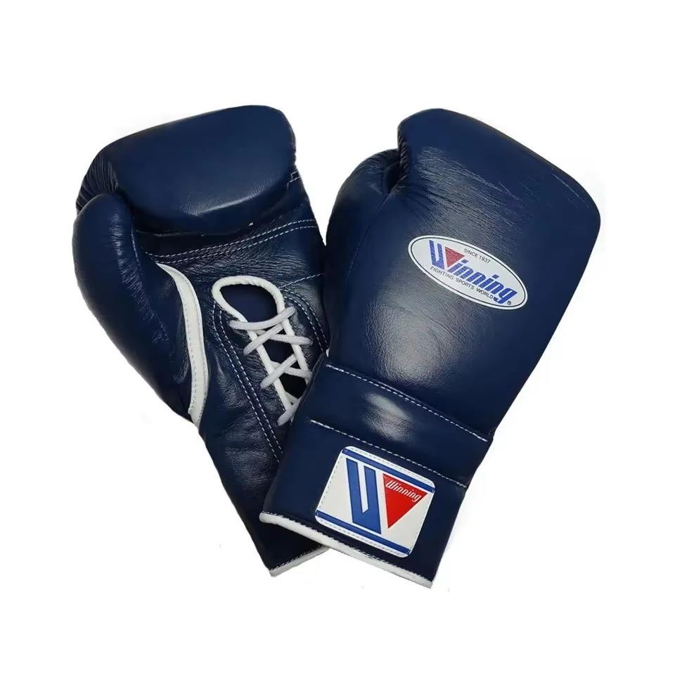 High Quality Custom Dark Blue Leather Sanda Boxing Gloves Hook Loop Closure LACED Wrist Professional Winning Sparring Gear Set