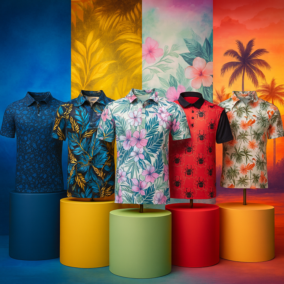 เสื้อโปโลกอล์ฟ OEM คุณภาพสูง ระบายอากาศได้ดี พิมพ์ลายเต็มตัวด้วยเทคนิค Sublimation ผลิตจากโพลีเอสเตอร์ 92% สแปนเด็กซ์ 18% รับออกแบบโลโก้ตามสั่ง