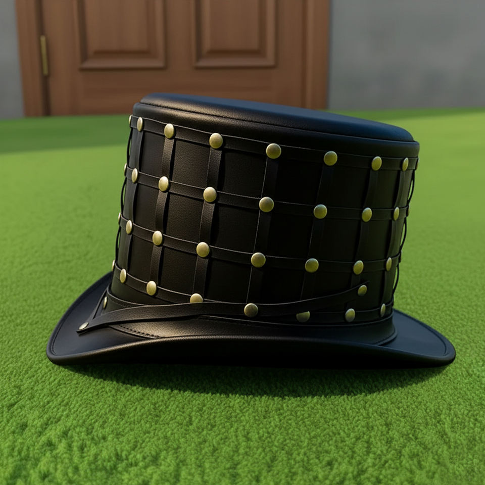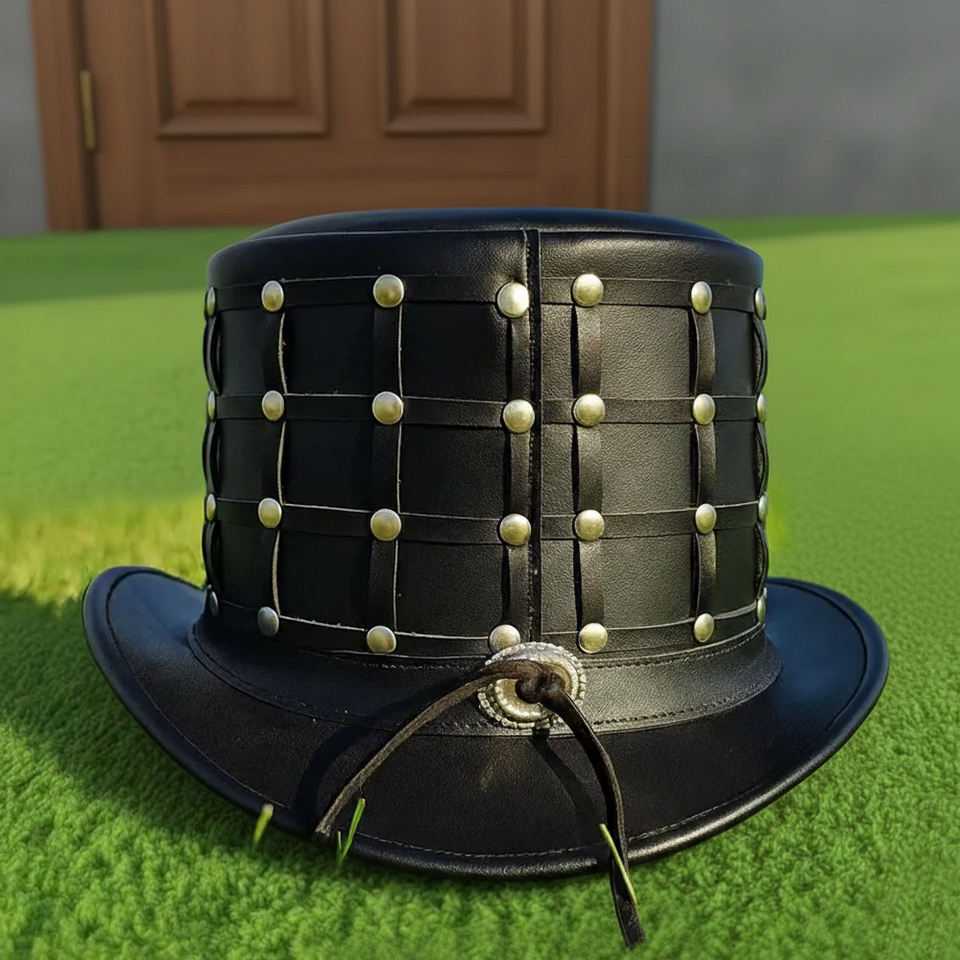 หมวกทรงสูงหนังแท้สีดำคุณภาพสูง งานแฮนด์เมด สำหรับทุกเพศ สไตล์สตีมพังก์ โกธิค เหมาะสำหรับงานเทศกาล