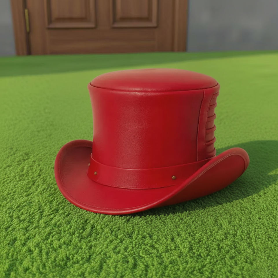 หมวกทรงสูงหนังสีแดงทำมือคุณภาพสูงแบบยูนิเซ็กซ์ พร้อมมงกุฎจีบแบบสตีมพังก์สำหรับคอสเพลย์