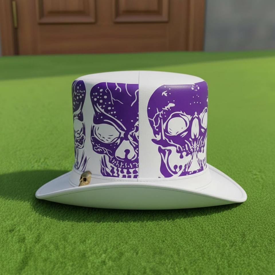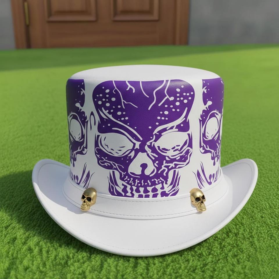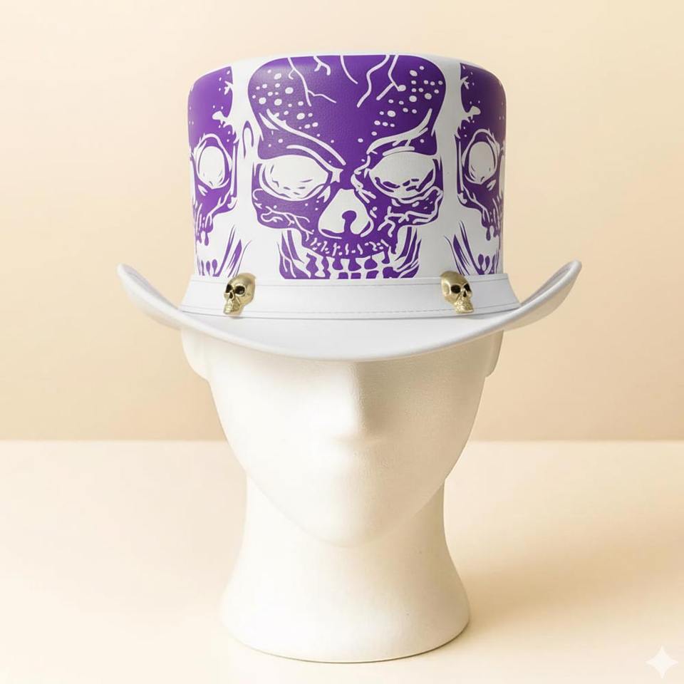หมวกทรงสูงหนังสีขาวทำมือคุณภาพสูงแบบยูนิเซ็กซ์ ประดับหัวกะโหลกสีม่วง สไตล์โกธิค สตีมพังก์ สำหรับงานเทศกาลและคอสเพลย์