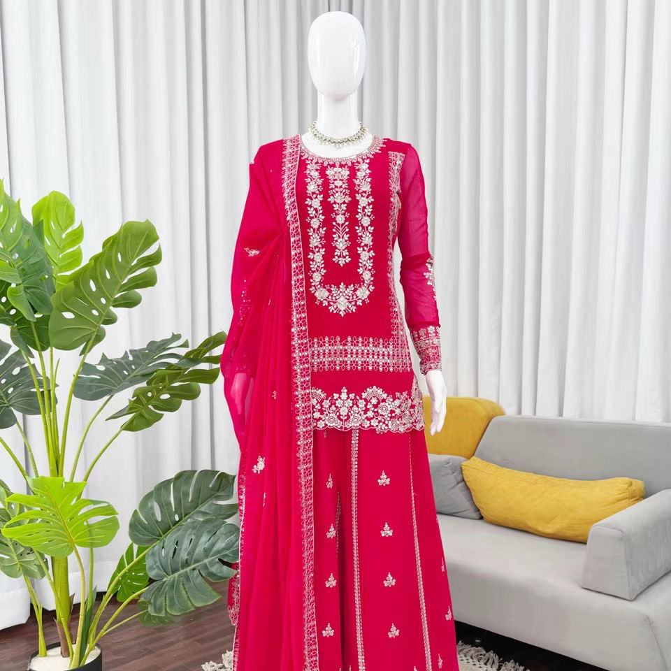 ชุดชาราราดีไซน์เนอร์คุณภาพสูงสำหรับผู้หญิง ผ้าจอร์เจตต์เทียม ปักลายอย่างมีระดับ โทนสีสวยงาม เหมาะสำหรับงานแต่งงานและงานเฉลิมฉลองต่างๆ