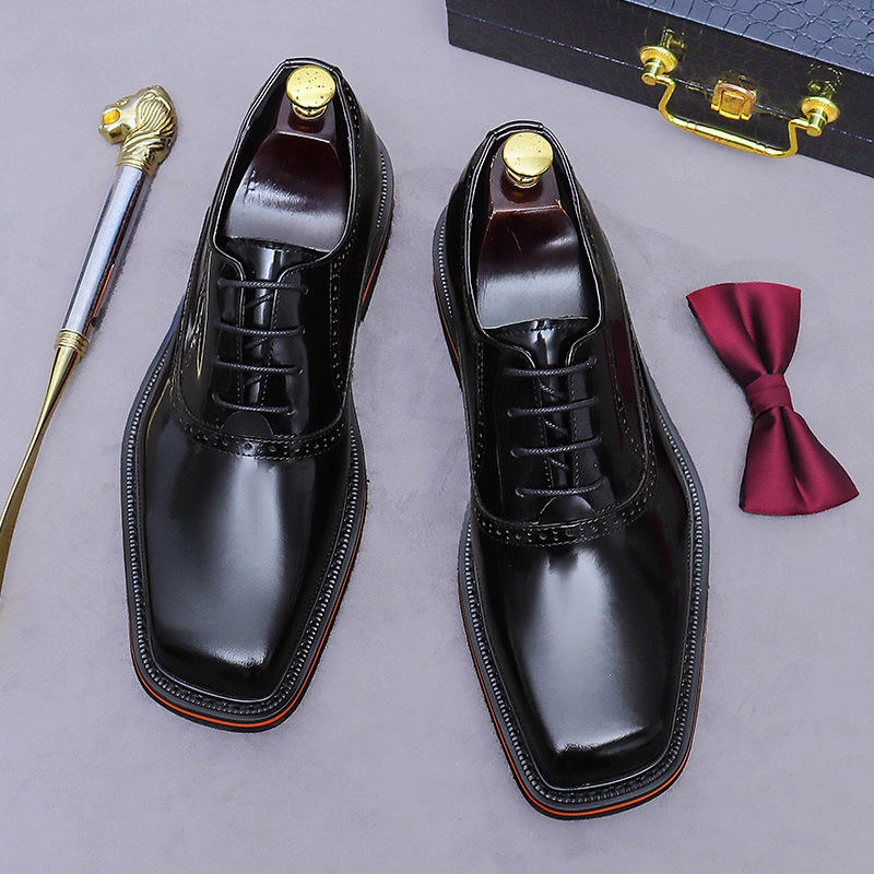 รองเท้าผู้ชายคุณภาพสูงหรูหรา พร้อมลวดลายที่ดีไซน์อย่างมีสไตล์บริเวณหัวรองเท้า รองเท้าแต่งงานหนังแท้สำหรับผู้ชาย