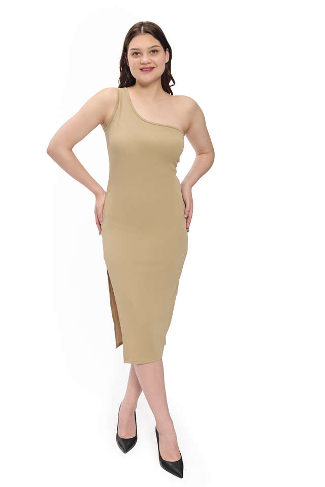 เดรสรัดรูปแต่งระบายไหล่ข้างเดียวคุณภาพสูงสำหรับผู้หญิงชุดเดรสยาวน่องผ่าข้างผ้าสแปนเด็กซ์สีเบจสำหรับงานปาร์ตี้และงานอีเว้นท์