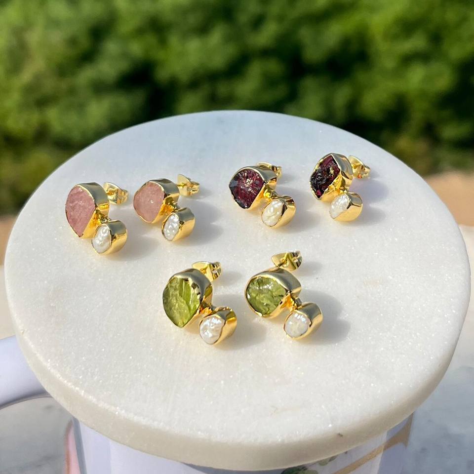 โกเมนดิบแบบไม่เจียระไนพร้อมต่างหูเม็ดเดี่ยวประดับมุกสีขาวทองเหลืองแข็งชุบทอง18K ขายส่งกระดุมเครื่องประดับ