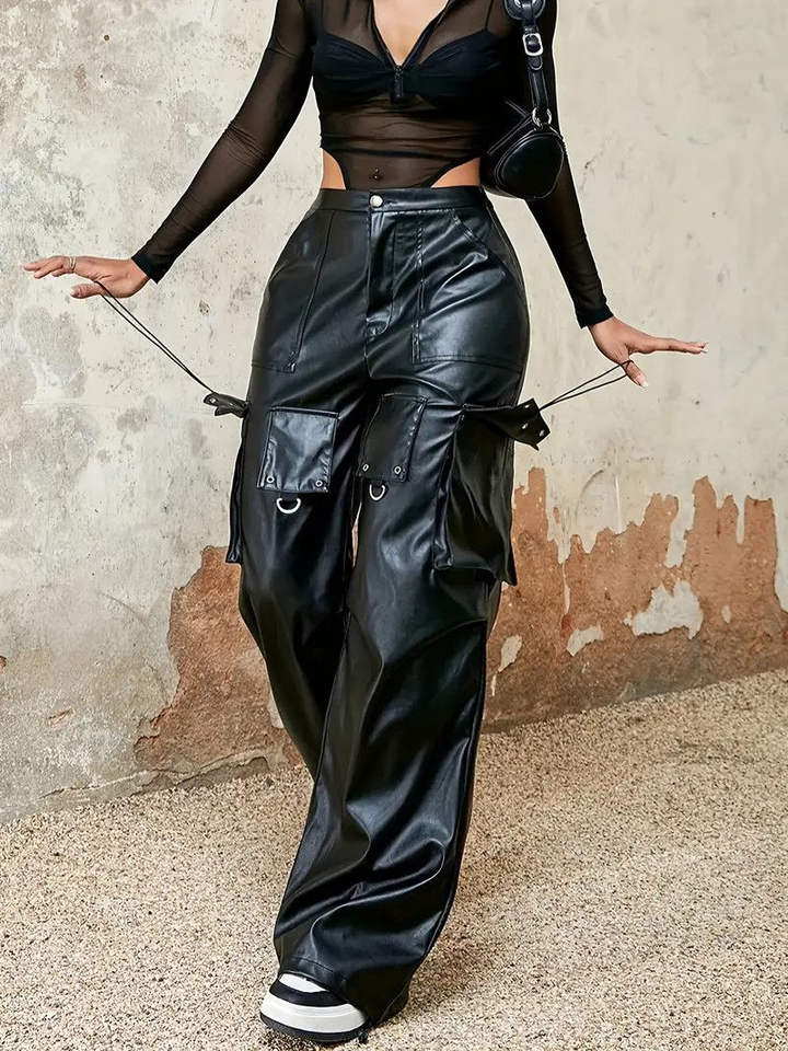 กางเกงหนังเอวสูงสำหรับผู้หญิงเสื้อผ้าลำลองทันสมัยทันสมัยมีกระเป๋าเชือกผูกสไตล์สตรีทแวร์