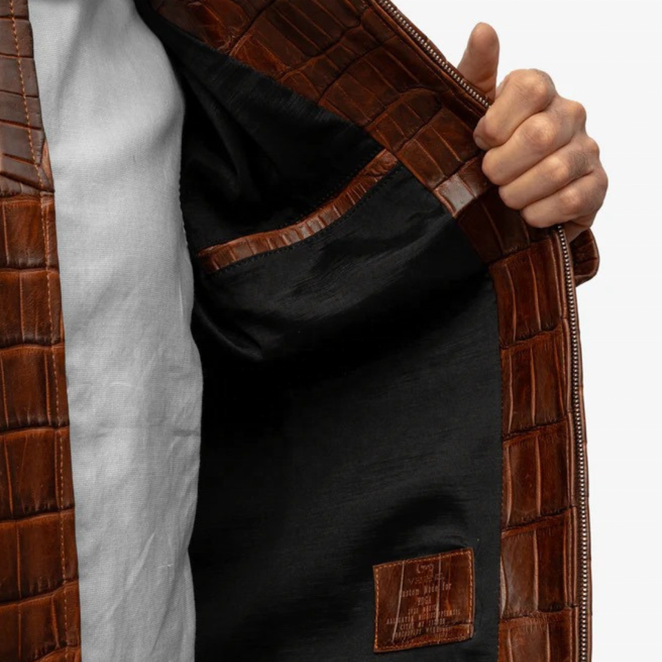 เสื้อแจ็คเก็ตหนังลายจระเข้คุณภาพสูงสำหรับผู้ชาย งานแฮนด์เมด สไตล์สตรีทแวร์ หนังจระเข้แท้ รับสั่งตัดเย็บตามแบบสำหรับผู้ชาย
