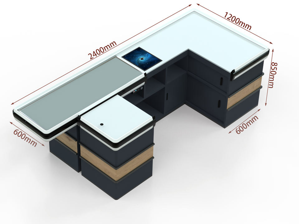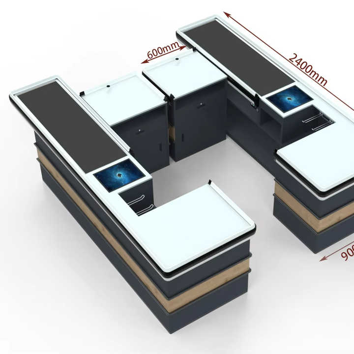 โต๊ะแคชเชียร์ไฮไบรท์สำหรับซูเปอร์มาร์เก็ต/ร้านขายของชำ ดีไซน์ทนทาน สีและขนาดปรับแต่งได้ วางได้หลายตำแหน่ง