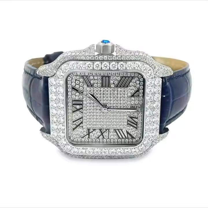 นาฬิกาควอตซ์ผู้ชายประดับเพชรโมอิสซาไนต์คุณภาพสูงสุด VVS พร้อมหน้าปัดกระจก ดีไซน์เรเดียนท์ โครงสร้างแข็งแรง หรูหราพรีเมียม