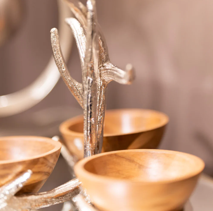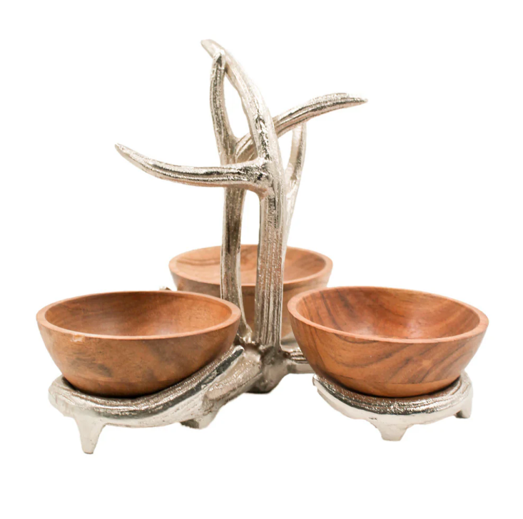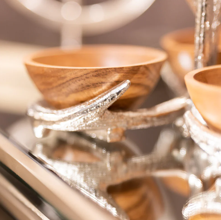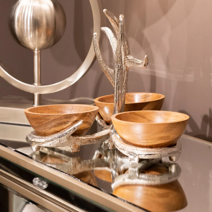 ชามไม้เขากวางโลหะตั้งโต๊ะสำหรับตกแต่งโต๊ะแต่งงานผลไม้ของหวานผลไม้แห้งผลไม้เสิร์ฟบนโต๊ะอาหารในบ้านห้องครัว