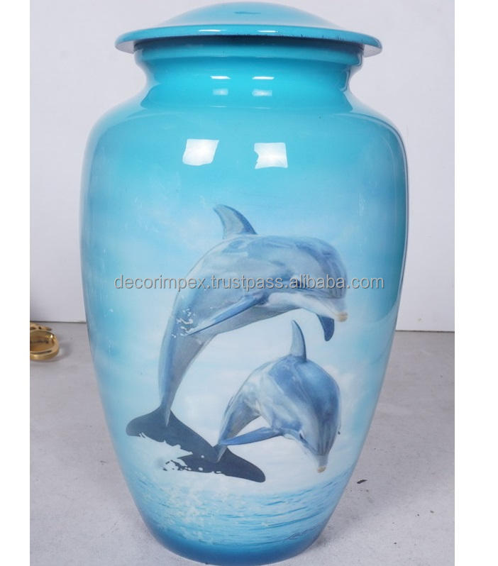 แจกันทรงโลมาสำหรับขี้เถ้าผู้ใหญ่ทำจากทองเหลืองทันสมัยเคลือบด้วยโลหะสีน้ำเงินและดำแจกันวางบนโต๊ะ