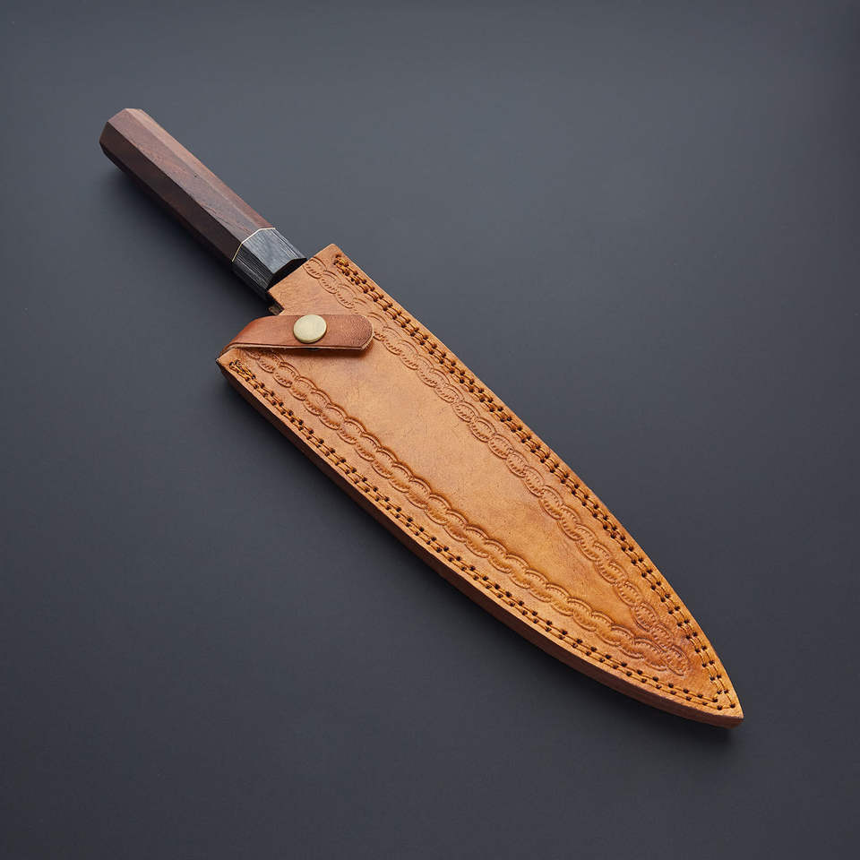 มีดทำครัวเหล็กดามัสกัสทำด้วยมือพร้อมใบมีดเหล็กคาร์บอนและปลอกหนังสำหรับตัดผัก