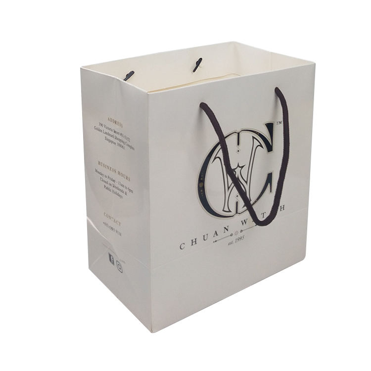 ถุงของขวัญกระดาษขาวคุณภาพพรีเมียมอย่างดี แนะนำเป็นอย่างยิ่ง พร้อมกราฟิกสีดำแบบมินิมอล สำหรับร้านค้าแบรนด์แบบป๊อปอัพ