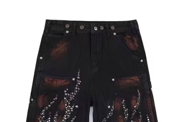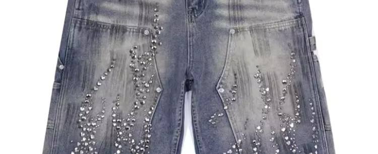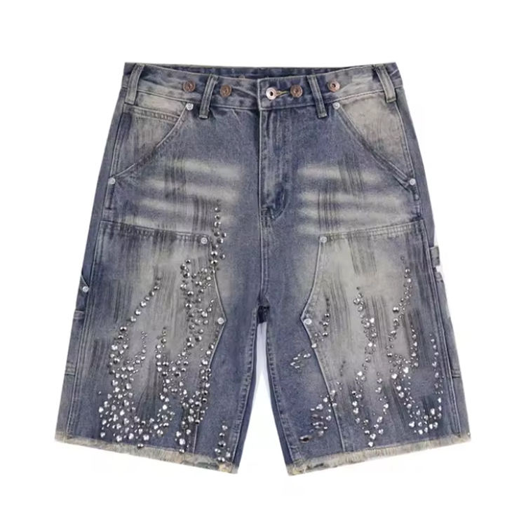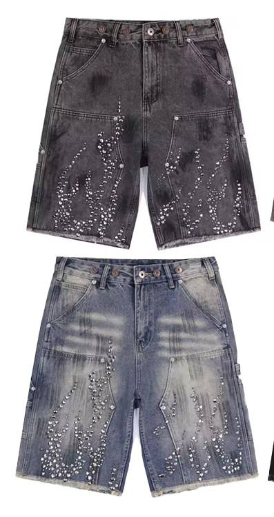 กางเกงยีนส์ขาสั้นคุณภาพสูง เนื้อผ้าหนา สไตล์สตรีทแวร์ ผ้าฝ้าย 100% ทรงตรง สีซีด แต่งหมุดและคริสตัล ลุคคาร์เพนเตอร์ น่ารัก เหมาะสำหรับฤดูร้อน