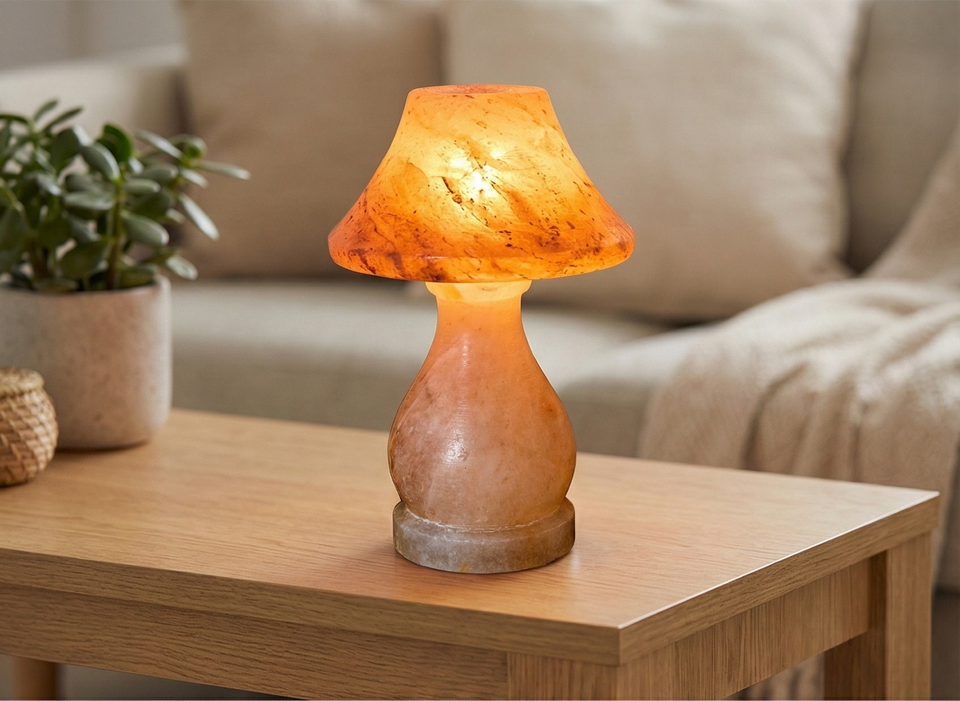 โคมไฟเกลือหิมาลัยรูปทรงร่ม ทำจากเกลือสีชมพูธรรมชาติ สำหรับตกแต่งบ้านและให้แสงสว่าง