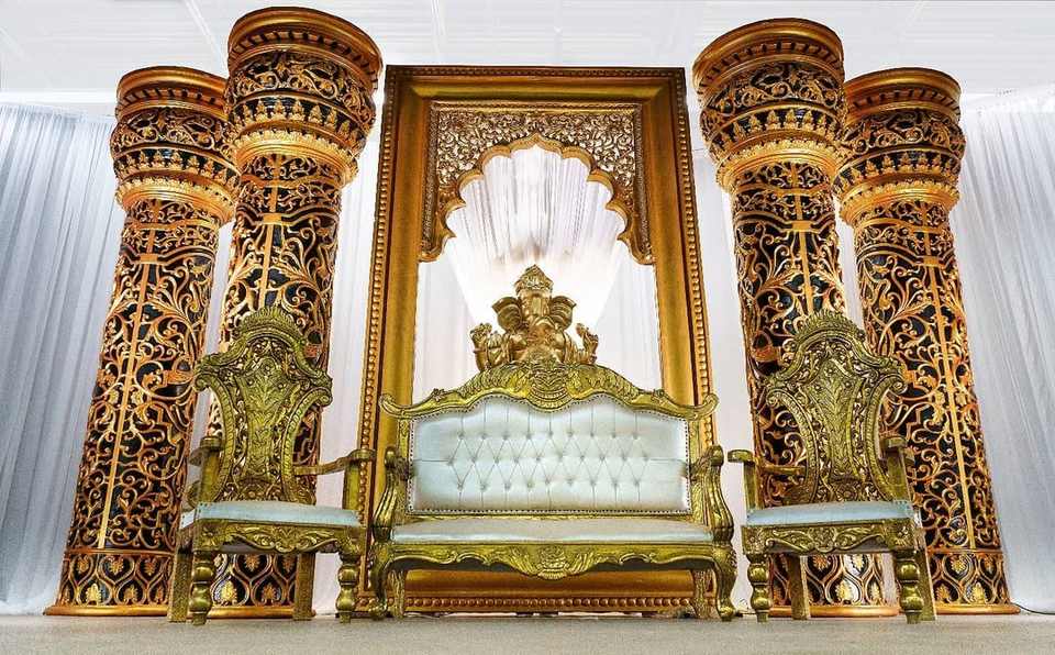 แผงพื้นหลังสำหรับเวทีงานแต่งงานของฮินดูแผงหลังแกะสลักสีทองสำหรับงานแต่งงานสไตล์ C ที่มีชื่อเสียงของอังกฤษ