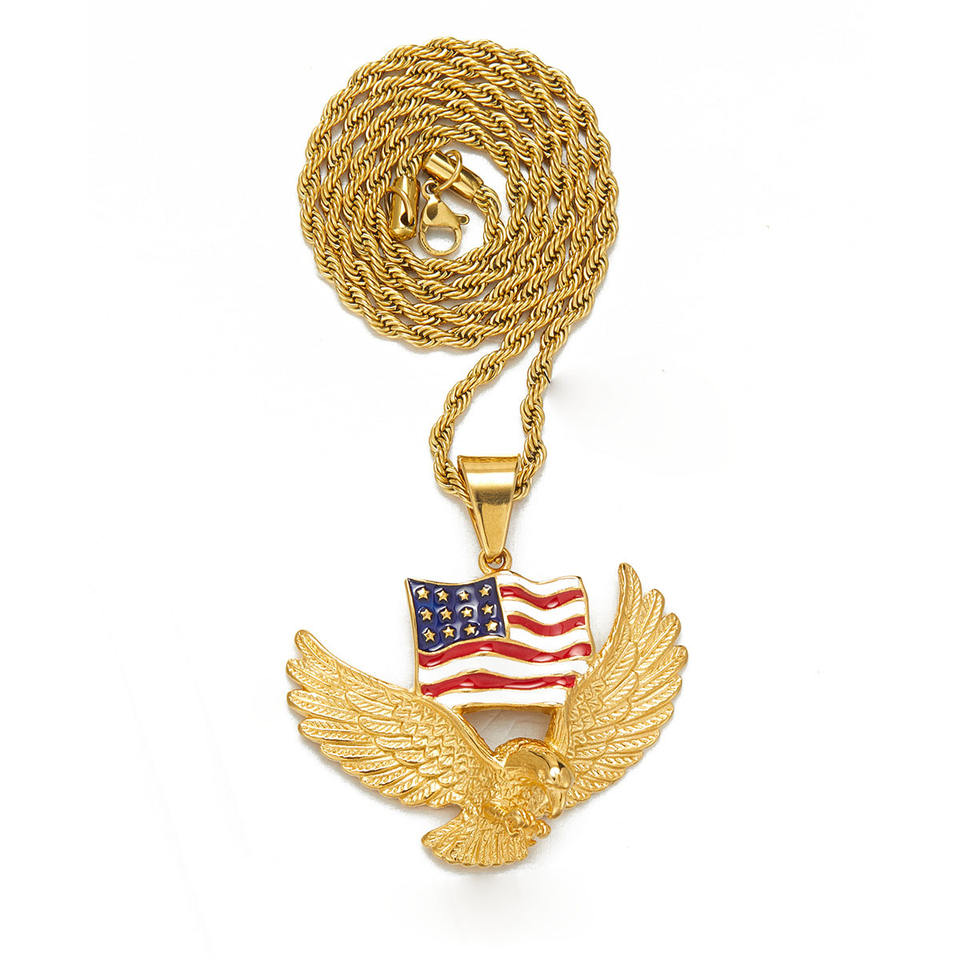 ฮิปฮอปธงชาติอเมริกันนกอินทรีหัวล้านกันน้ำสแตนเลสเครื่องประดับแฟชั่นสร้อยคอจี้ชุบทอง18K ผู้ชายผู้ชาย